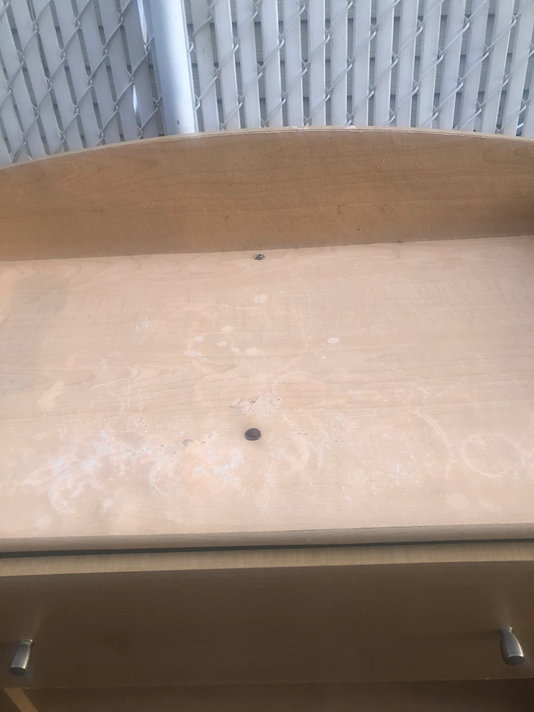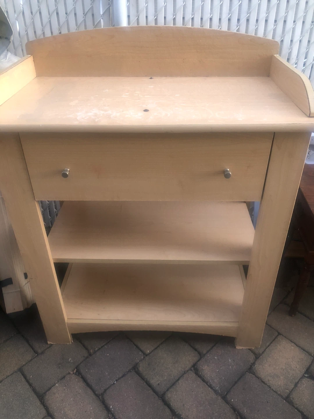 This is a wooden changing table. It has one drawer and two open shelves for storage. The surface has some light scuffs and marks. Made of wood composite.