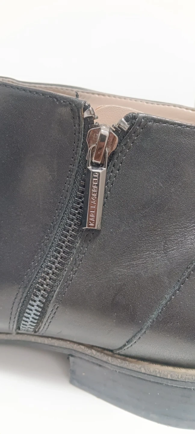 These are black leather ankle boots from Karl Lagerfeld. They feature a side zipper with a branded pull tab. The boots have a pointed toe and a low heel.
