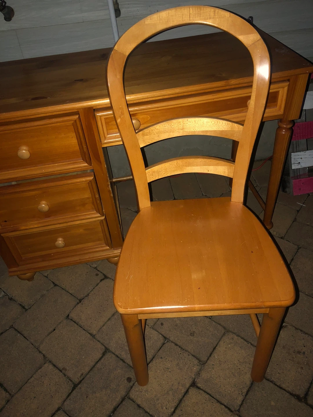 This is a solid wood desk with drawers and a matching chair. The desk has a warm, natural wood finish. It's great for a home office or study area. The chair complements the desk's style.