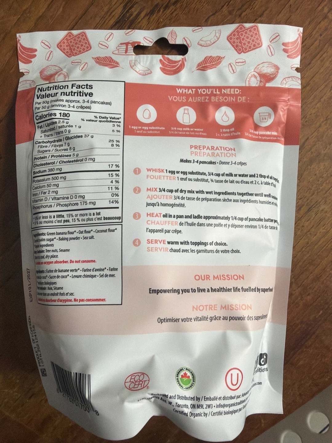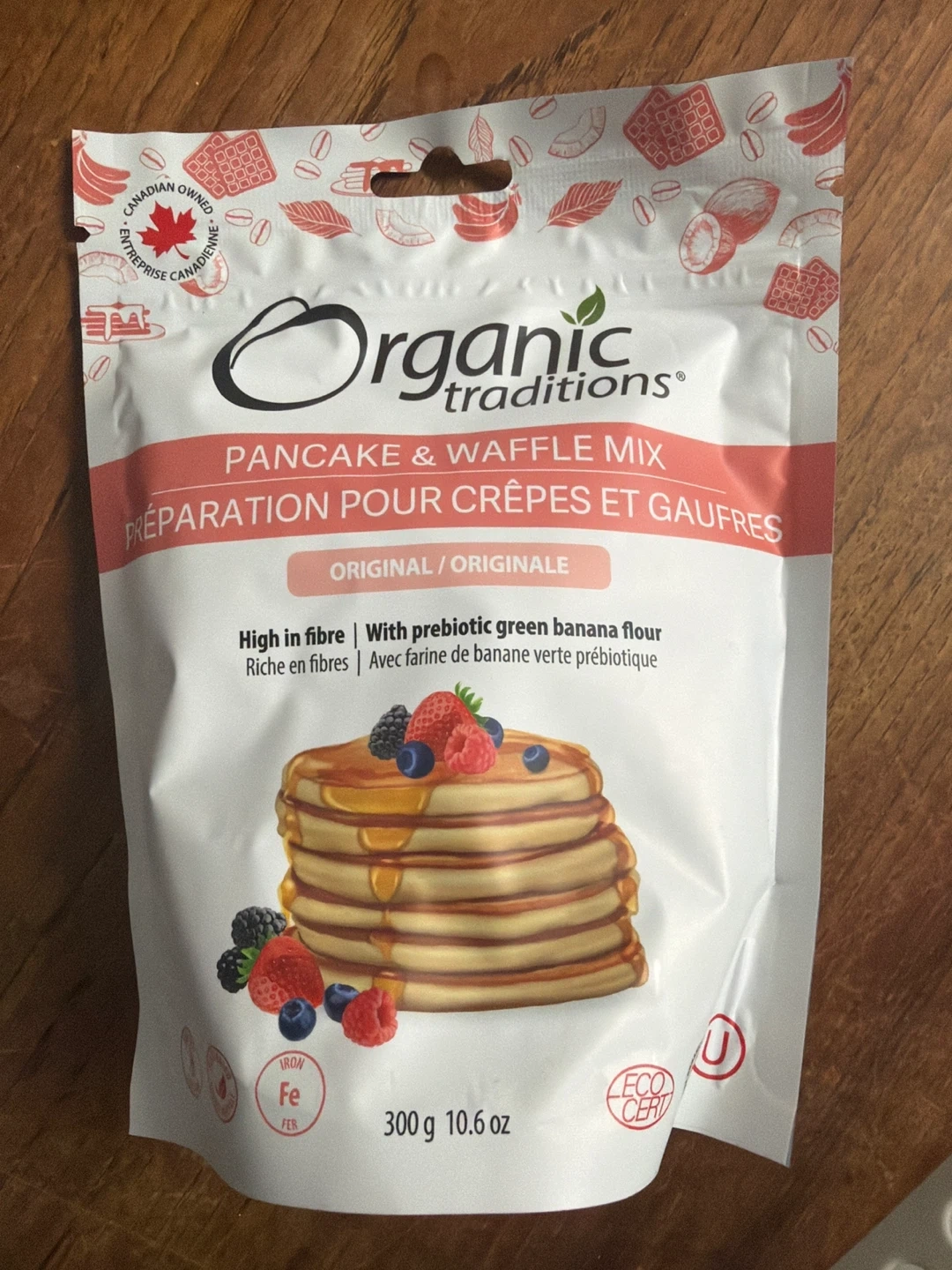 This Original Pancake & Waffle Mix from Organic Traditions is high in fibre with prebiotic green banana flour. It contains tree nuts and sesame. Store in a cool, dry place. Best by January 2027.