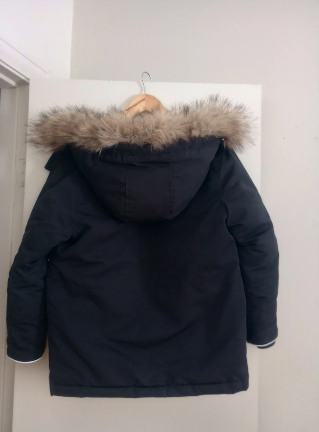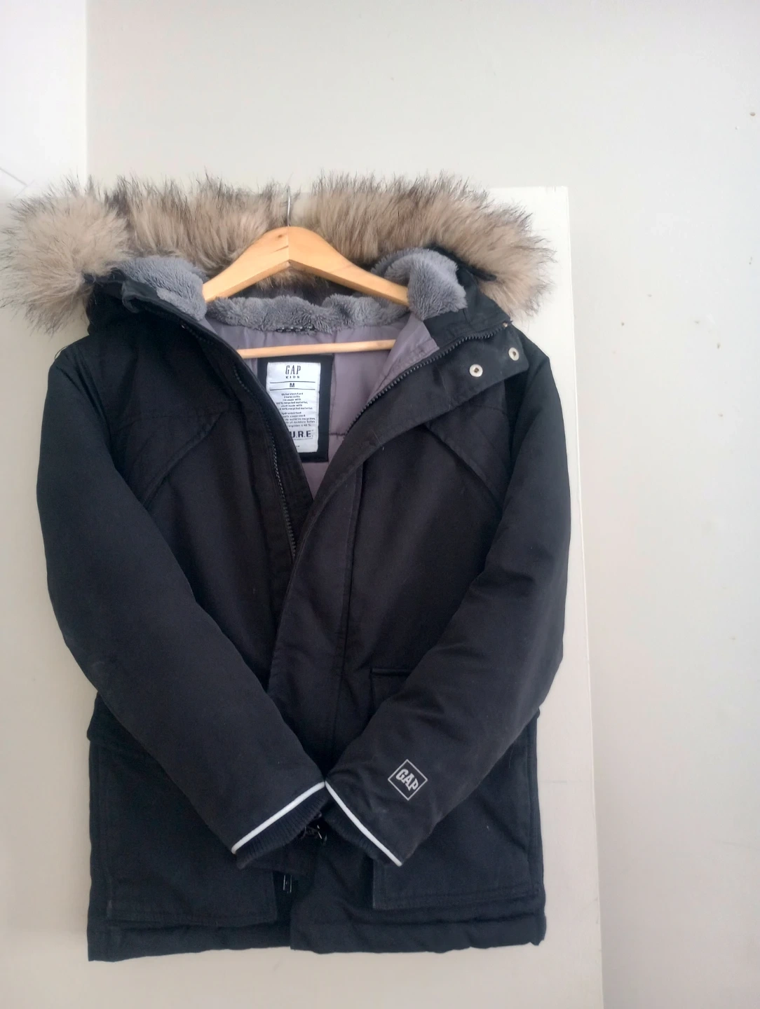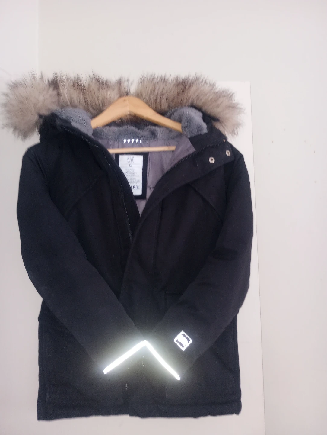 This is a black GAP Kids parka jacket, in great condition and also has safety reflective details on the cuffs.