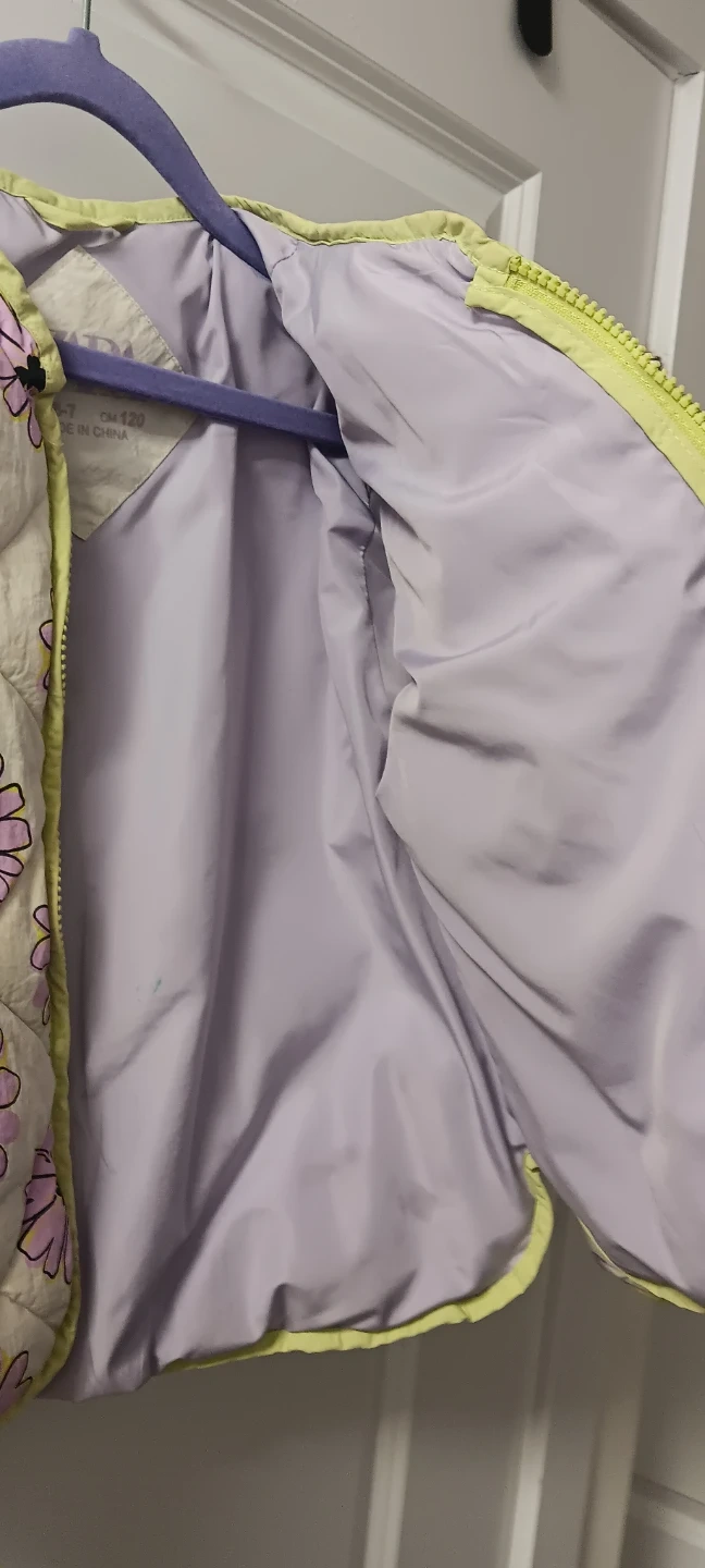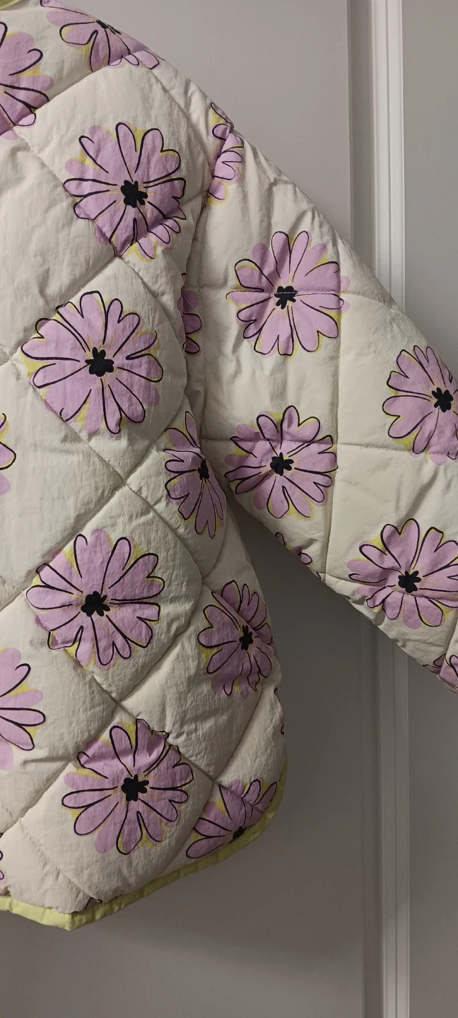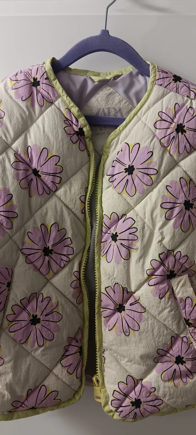 Quilted jacket by Zara featuring a cream base with a fun pink and yellow floral pattern. It's a size 6-7 years (CN 120). Perfect for layering during cooler weather!