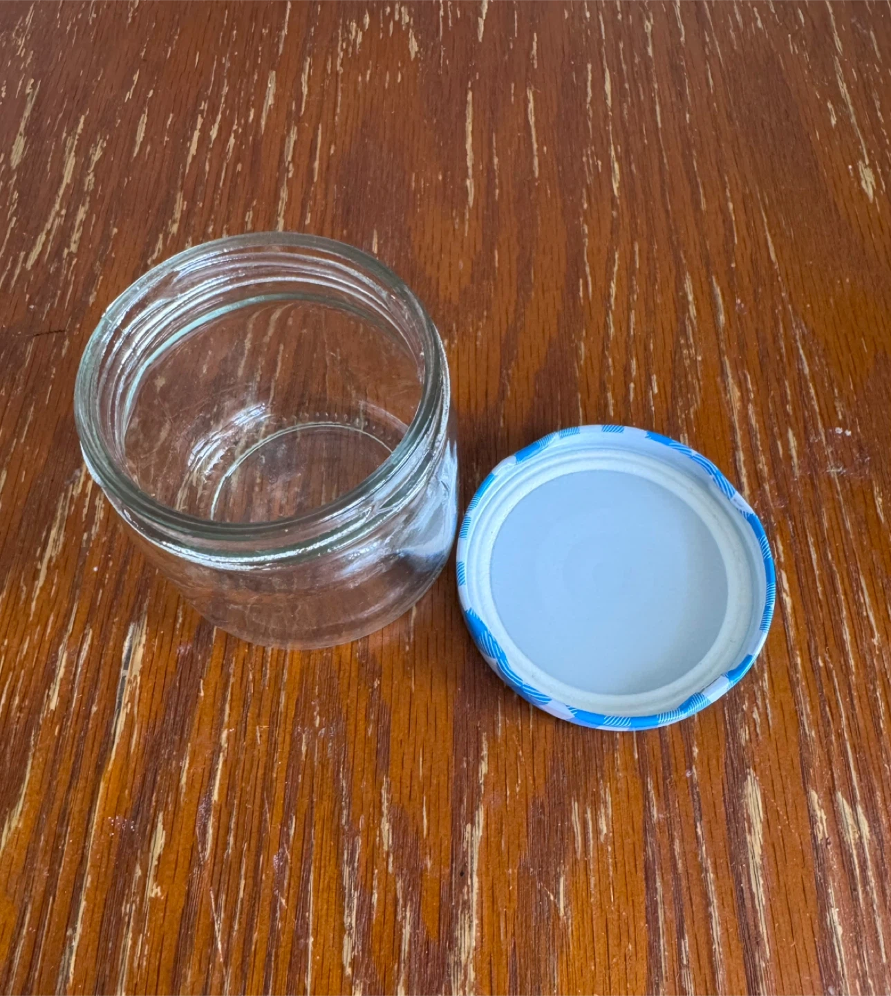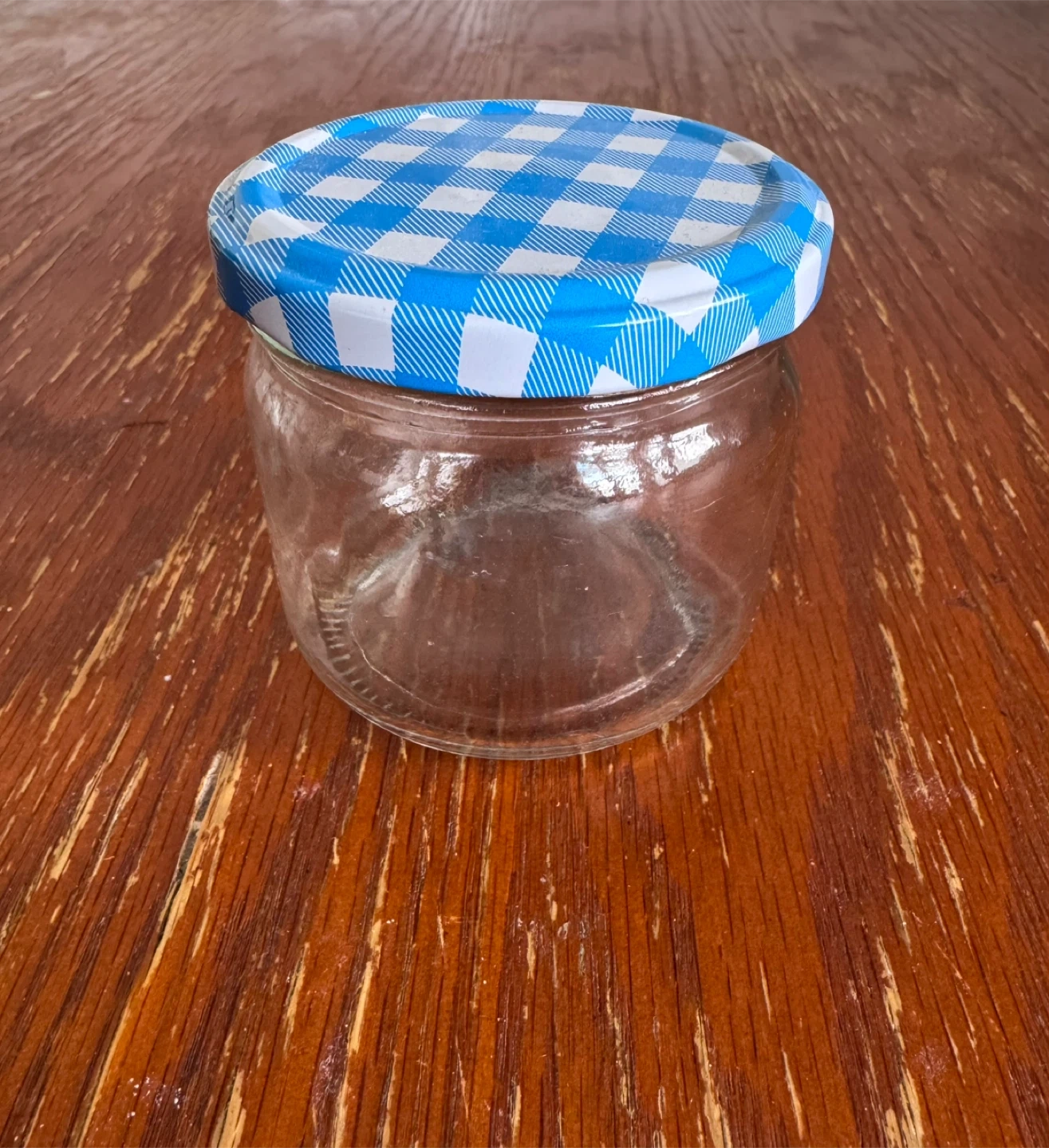 A clear small glass jar with a blue and white lid. It's empty and ready for your homemade jams, pickles, or crafts. This jar is perfect for storing small items or for decorative purposes.