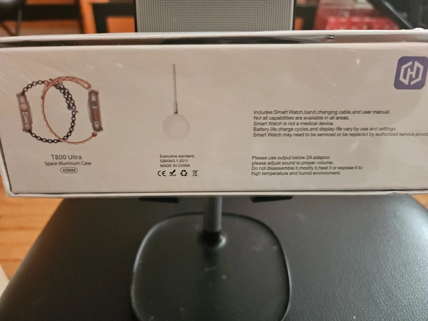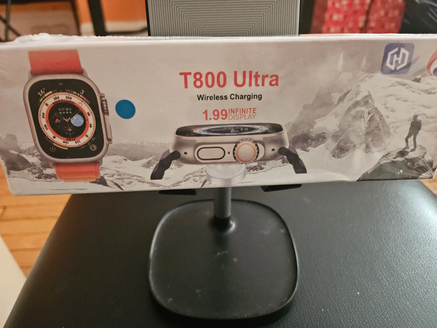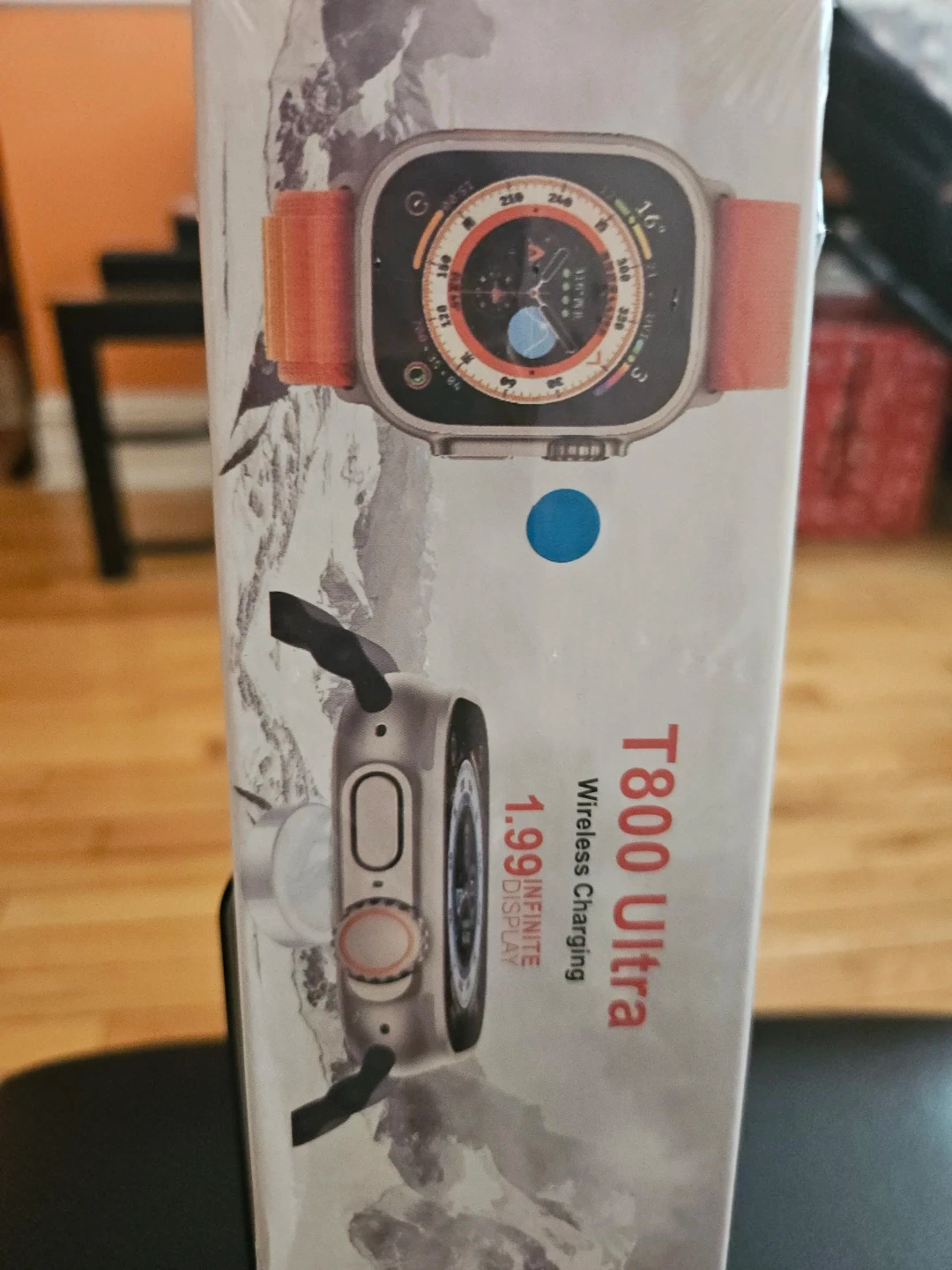 This T800 Ultra smartwatch comes with a smart watch band, charging cable, and user manual. It features a 1.99-inch infinite display and wireless charging. The case is made of space aluminum.