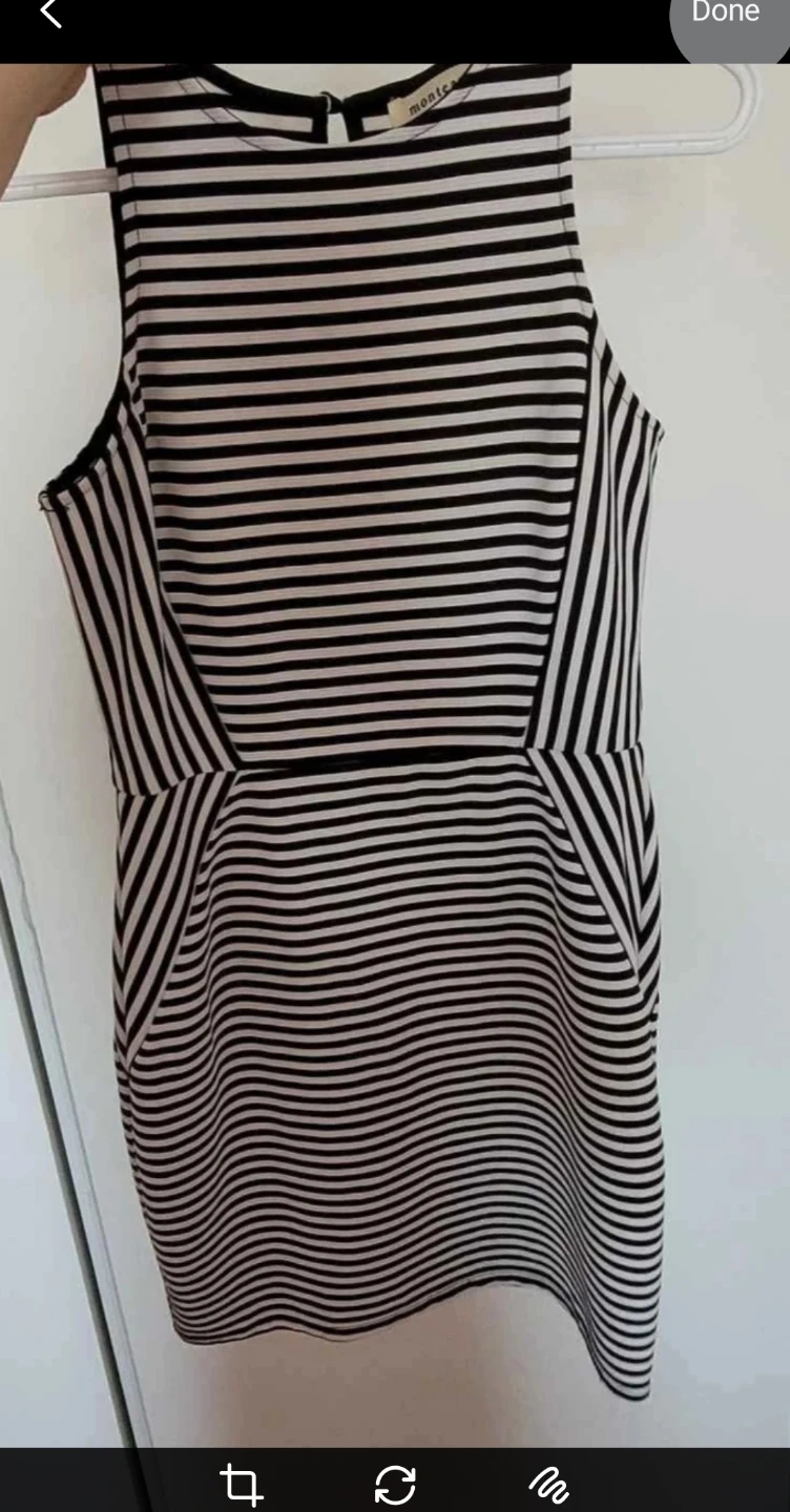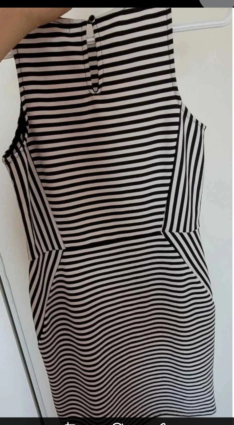 This is a sleeveless black and white striped bodycon dress from Mona Lisa. It's made of a stretchy material and has a classic crew neck. Perfect for a casual outing or to dress up!