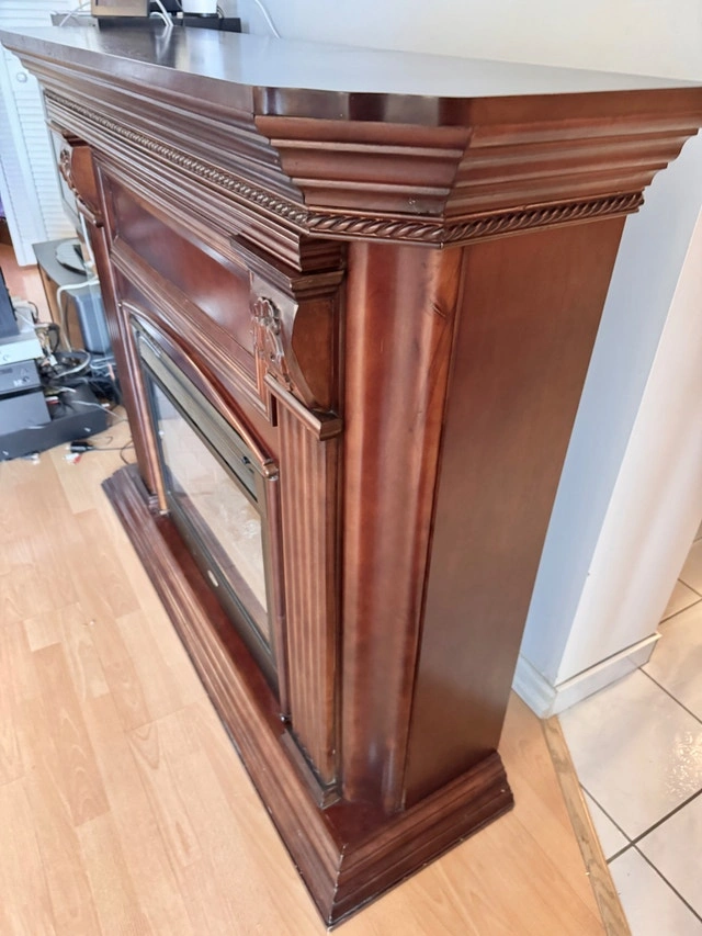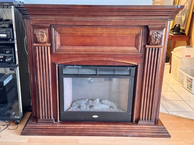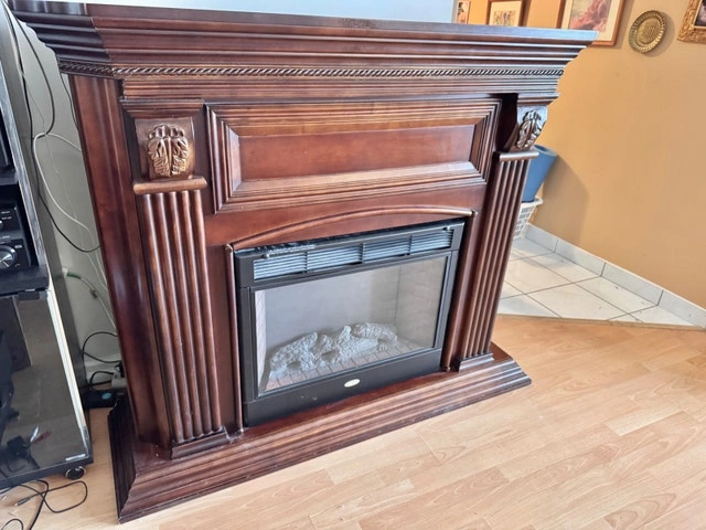 Classic electric heat emitting fireplace with a wood mantel. Priced to go ASAP. Dimensions: W 56" H 47" D 16". Used - Good condition. Cash and cashless payments accepted.