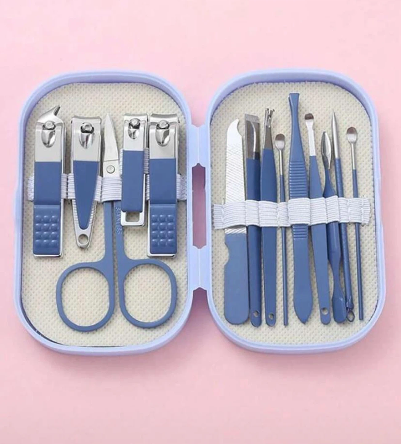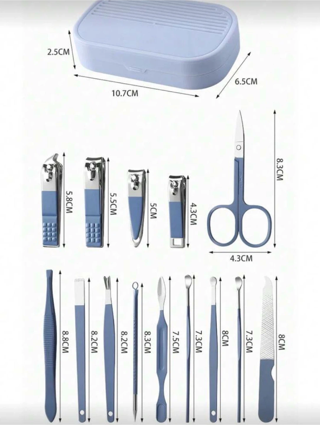 This 12-piece nail care kit includes clippers, scissors, tweezers, cuticle pushers, and files. It's all neatly organized in a compact blue travel case. Stainless steel tools for essential grooming needs!