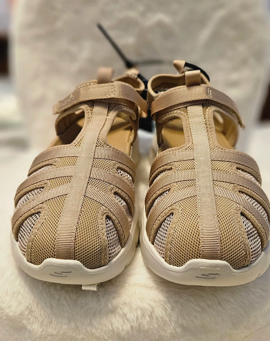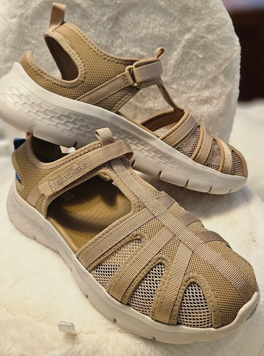 Explore the outdoors in effortless comfort with On-The-Go Flex Sandal - Jill. This t-strap sandal features a quick dry mesh/Lycra upper that dries 30% faster. The closed toe upper features webbing detail for breathability. The contoured Goga Mat™ footbed and Ultra GO® cushioning will keep you comfortable all day long. Machine washable.