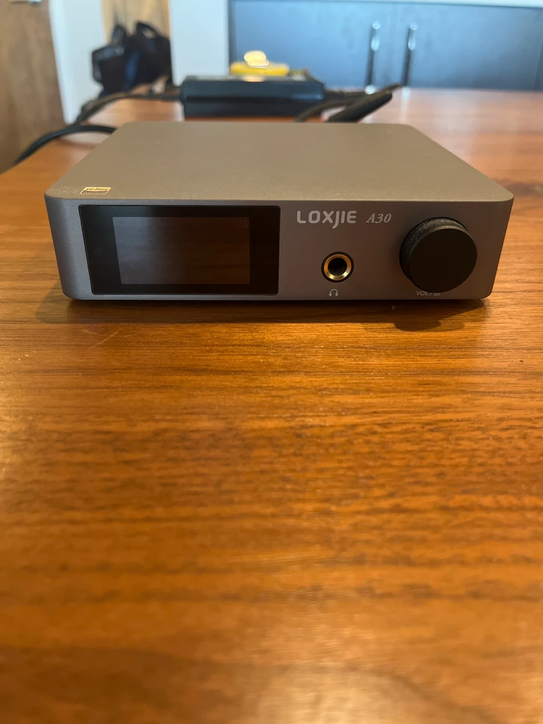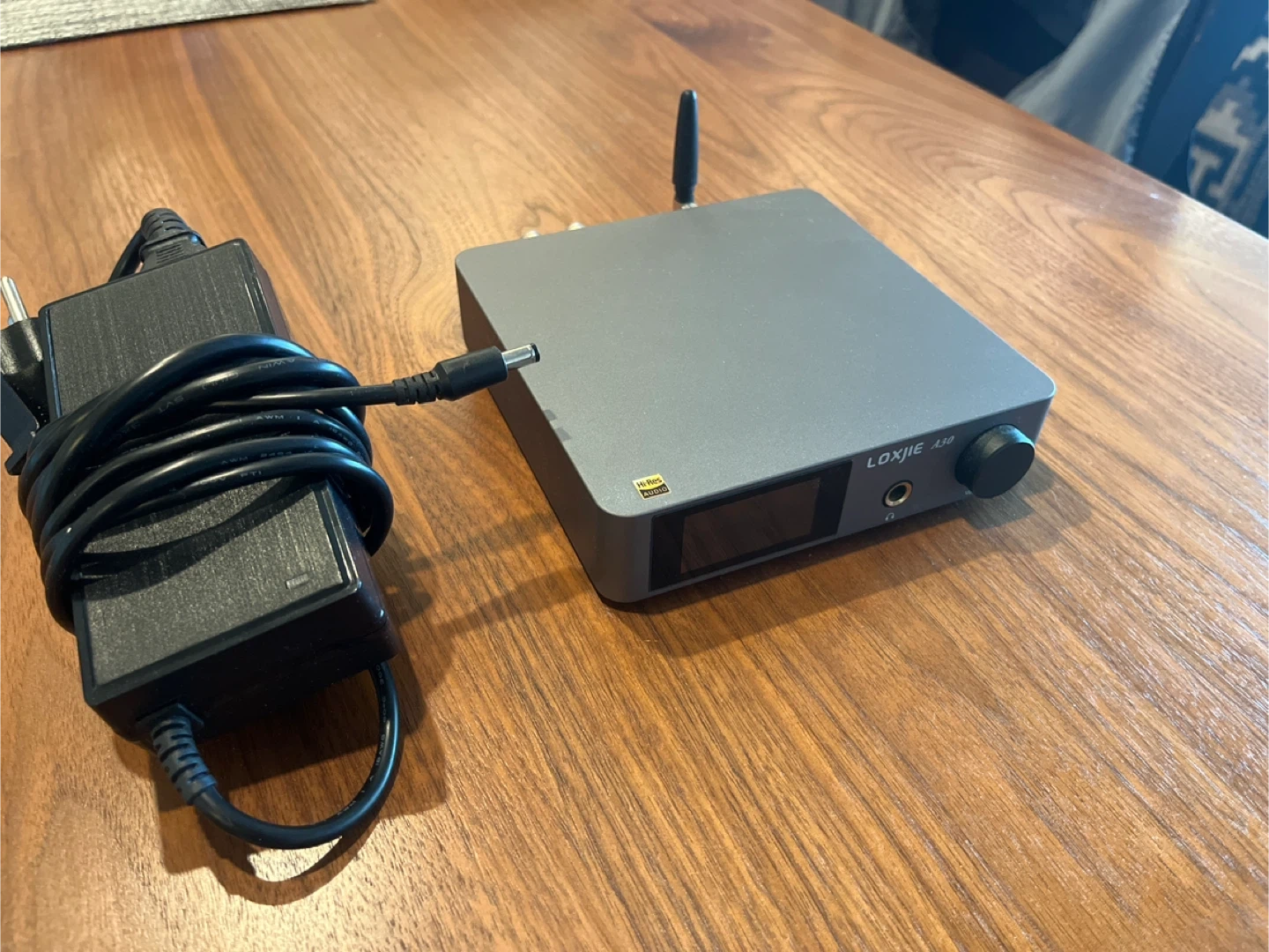 This is the LOXJIE A30 high-resolution power amplifier. It features multiple input options including USB, optical, and coaxial. The unit has speaker outputs and a headphone jack. It's a compact and versatile audio component.