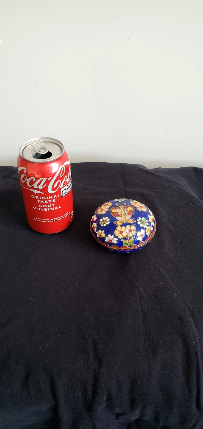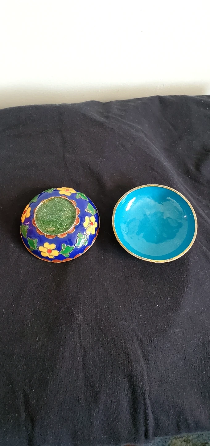 This is a lovely cloisonné trinket box with a vibrant floral design. It's perfect for storing small treasures. The blue enamel interior is in great shape! Needs a good cleaning.