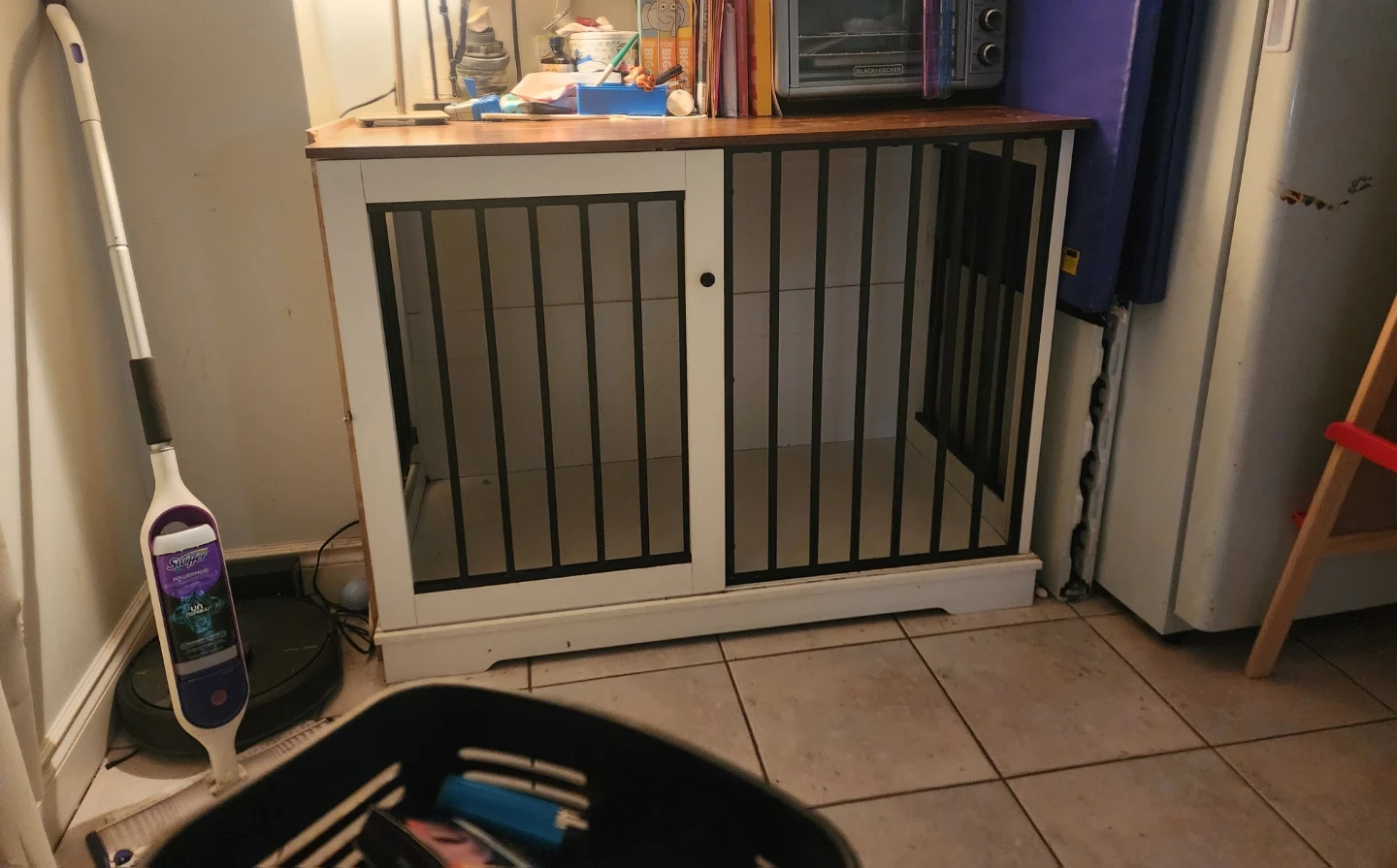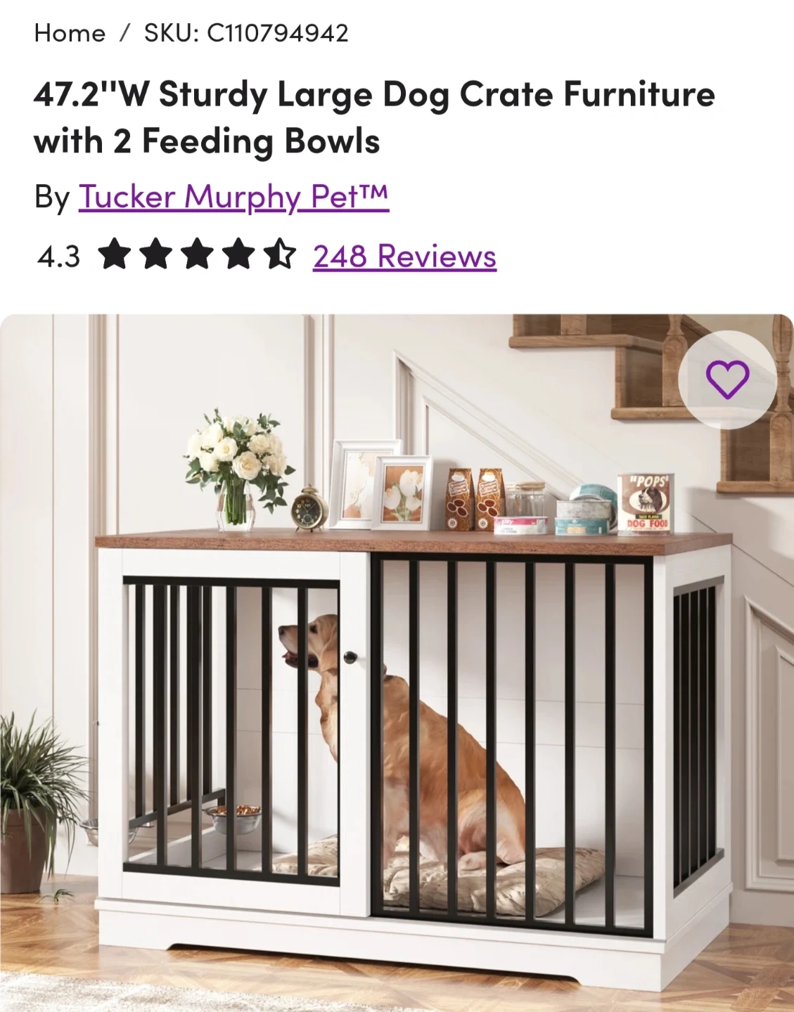 Sturdy large dog crate furniture with a white finish and black metal bars. It has a wooden top and a sliding door. Measures 47.2" wide. Perfect for providing your pet with a safe and stylish space.