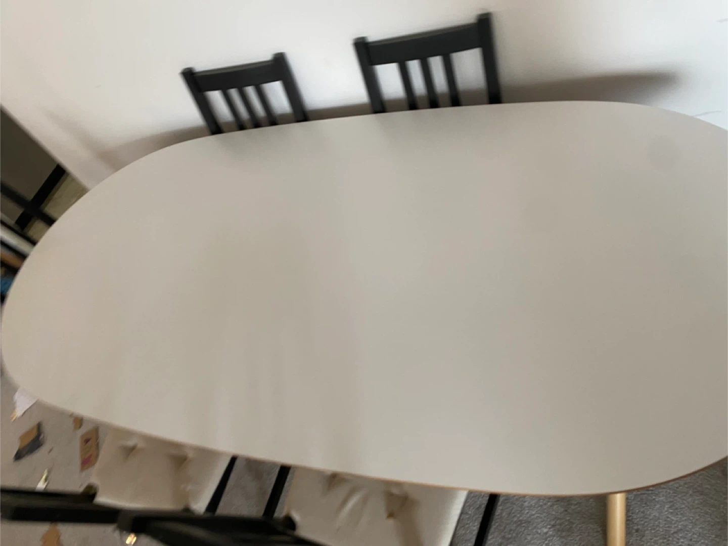 This is an oval dining table with six matching chairs. The table has a white top and a unique wooden base. The chairs are black with light beige upholstered seats. This set seats six people comfortably.