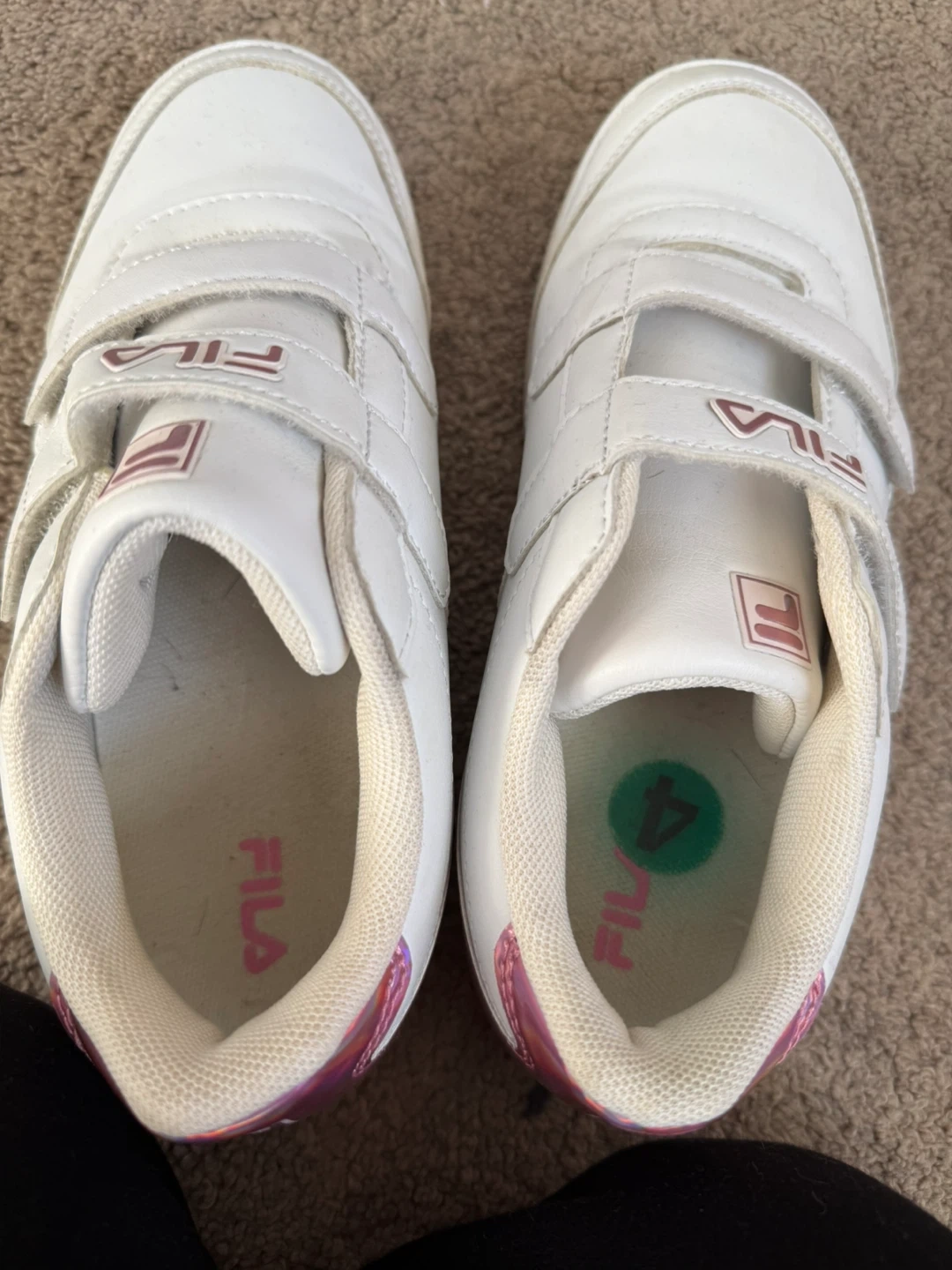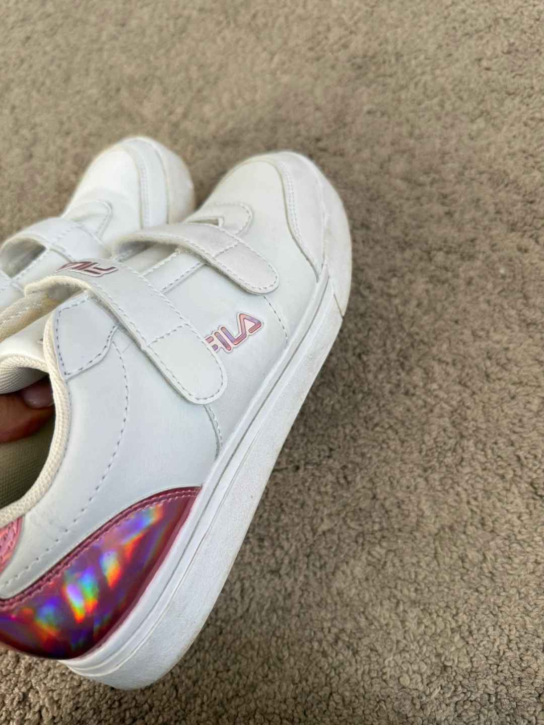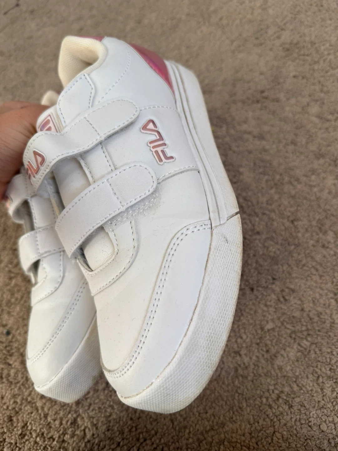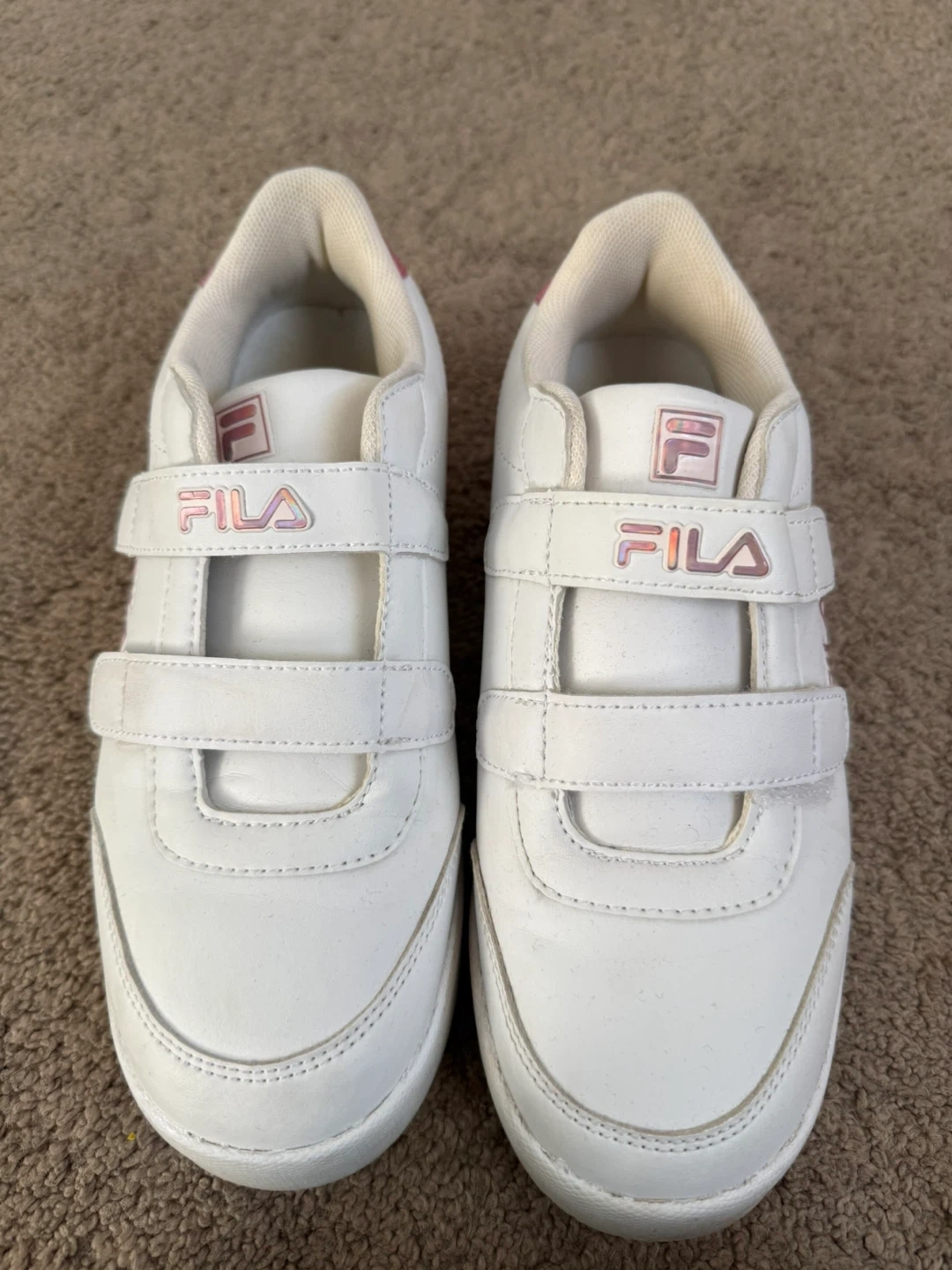 White Fila sneakers with hook-and-loop straps for easy wear. Features a pink and iridescent heel detail. Size is 4. and was worn once