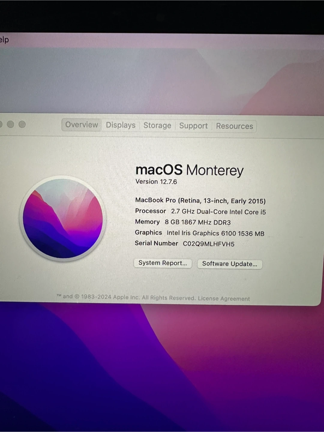 This is an Apple MacBook Pro, a 13-inch Retina model from early 2015. It's powered by a 2.7 GHz Intel Core i5 processor and comes with 8 GB of RAM. It runs macOS Monterey version 12.7.6.