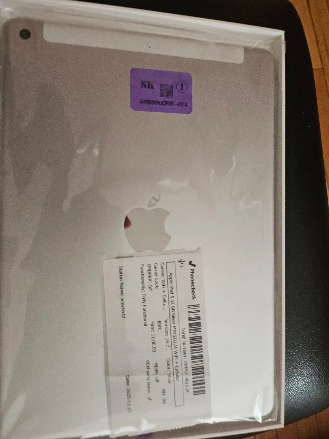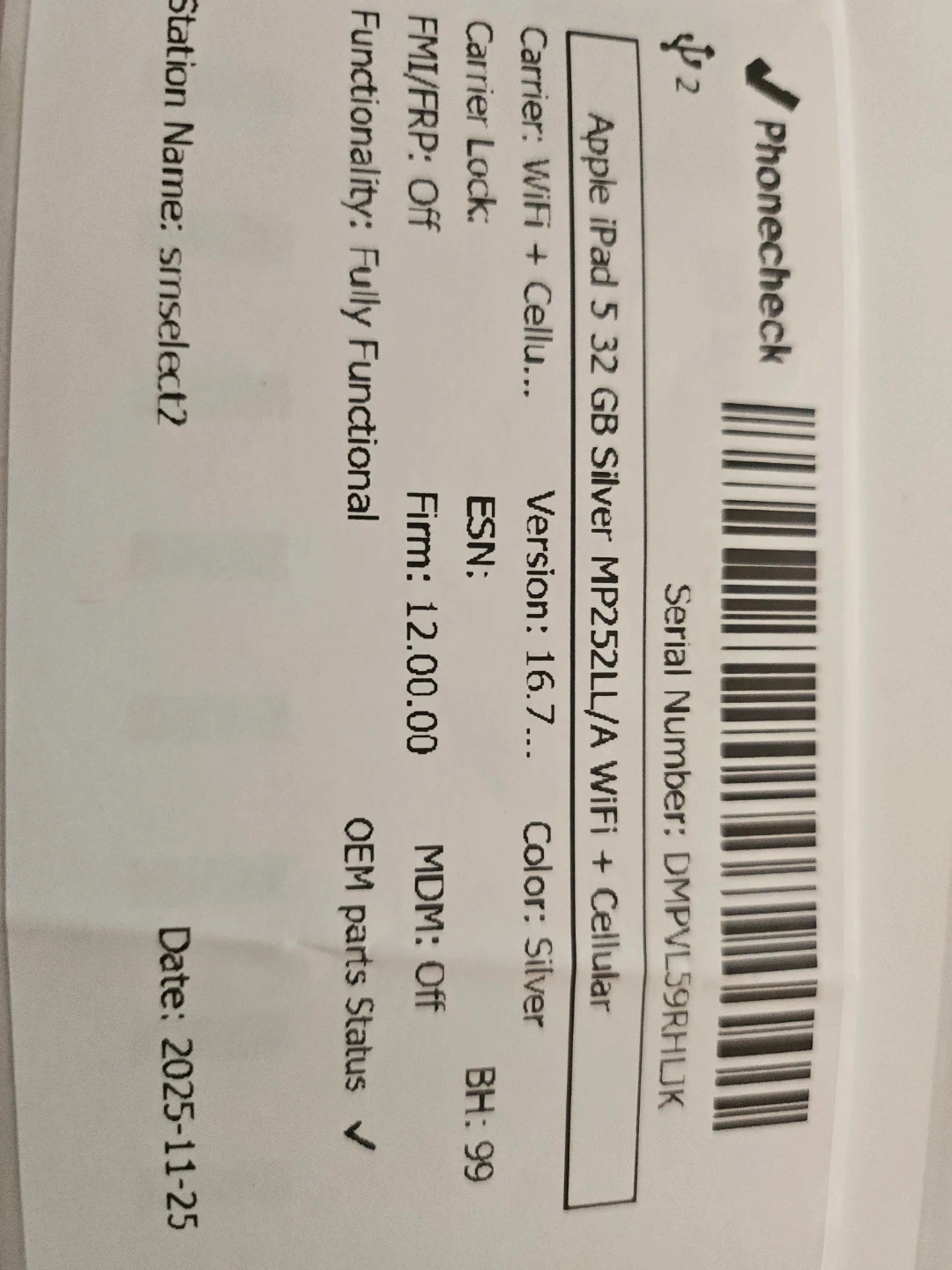 Apple iPad 5 with 32 GB storage in silver. It's a WiFi + Cellular model with version 16.7. Functionality is fully functional. Manufactured on 2025-11-25.