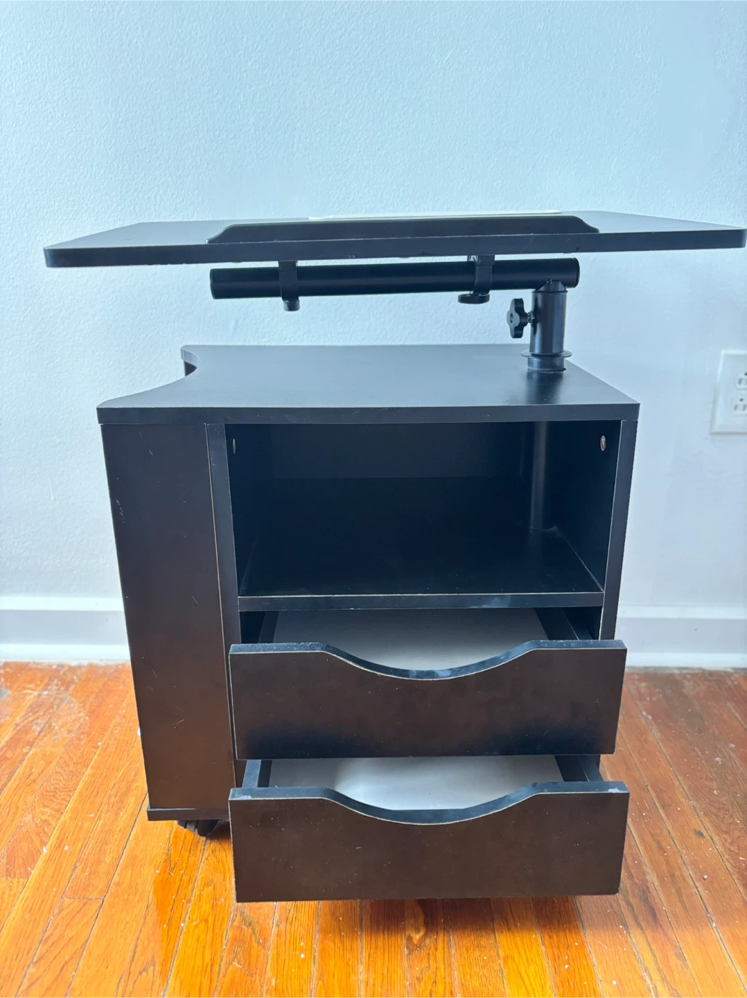 Black rolling nightstand / cabinet in good condition with an adjustable top surface.