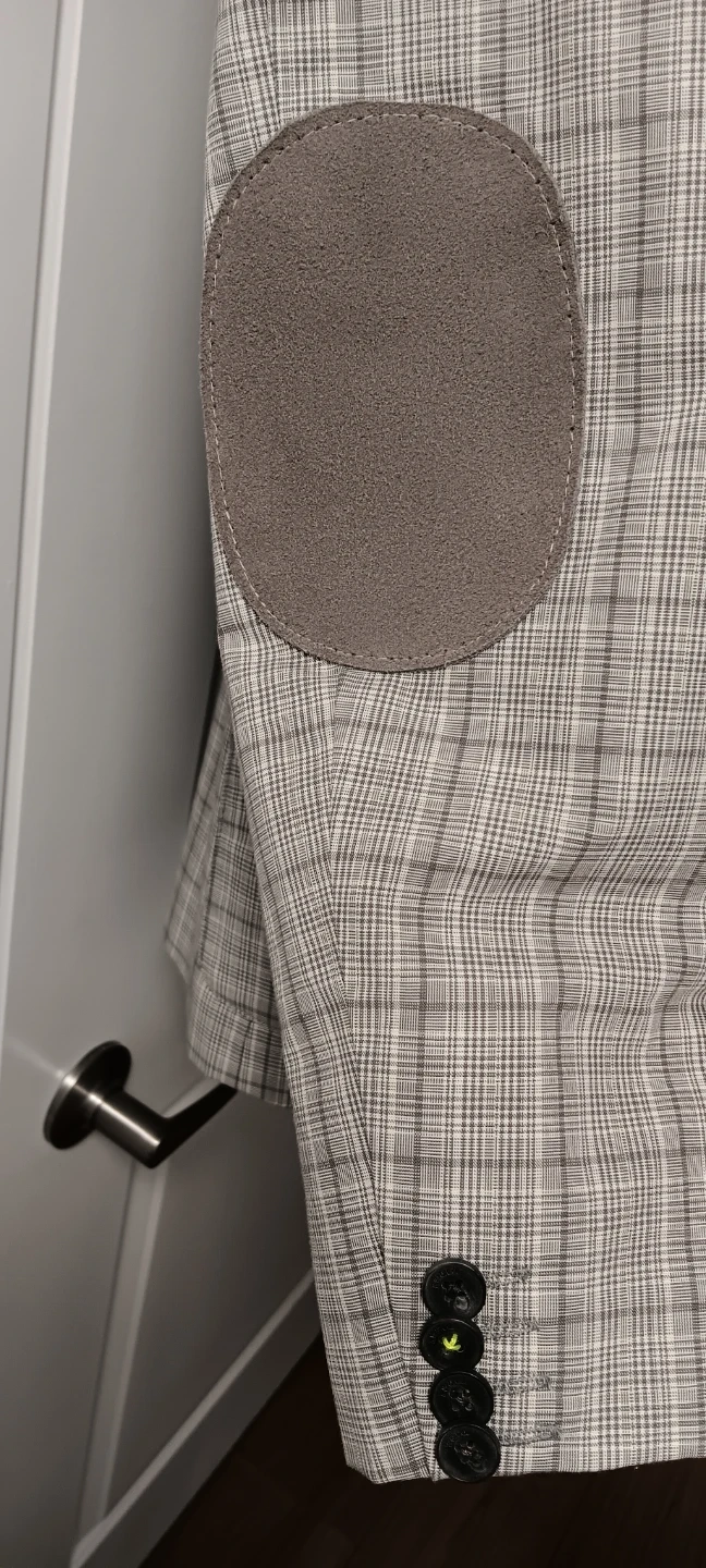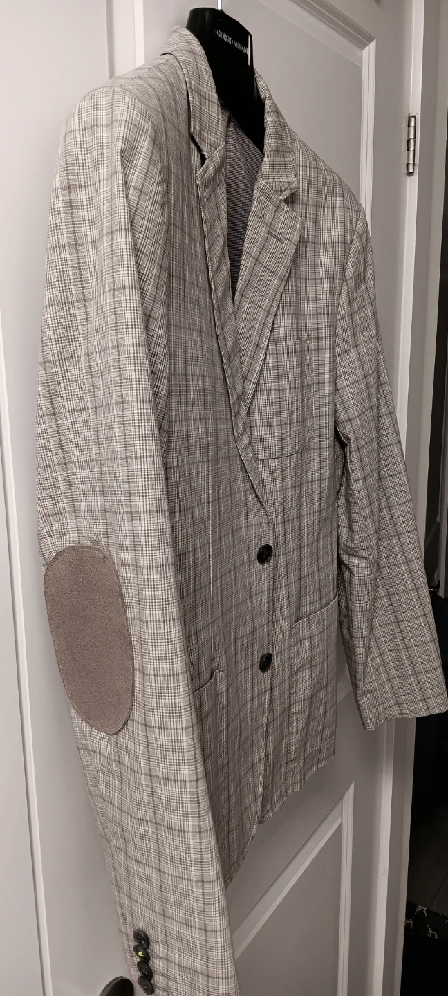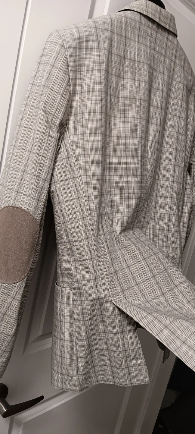 This is an RW&CO. blazer. It's a size medium with a plaid pattern and suede elbow patches. Features a two-button closure. It's great for smart casual occasions.