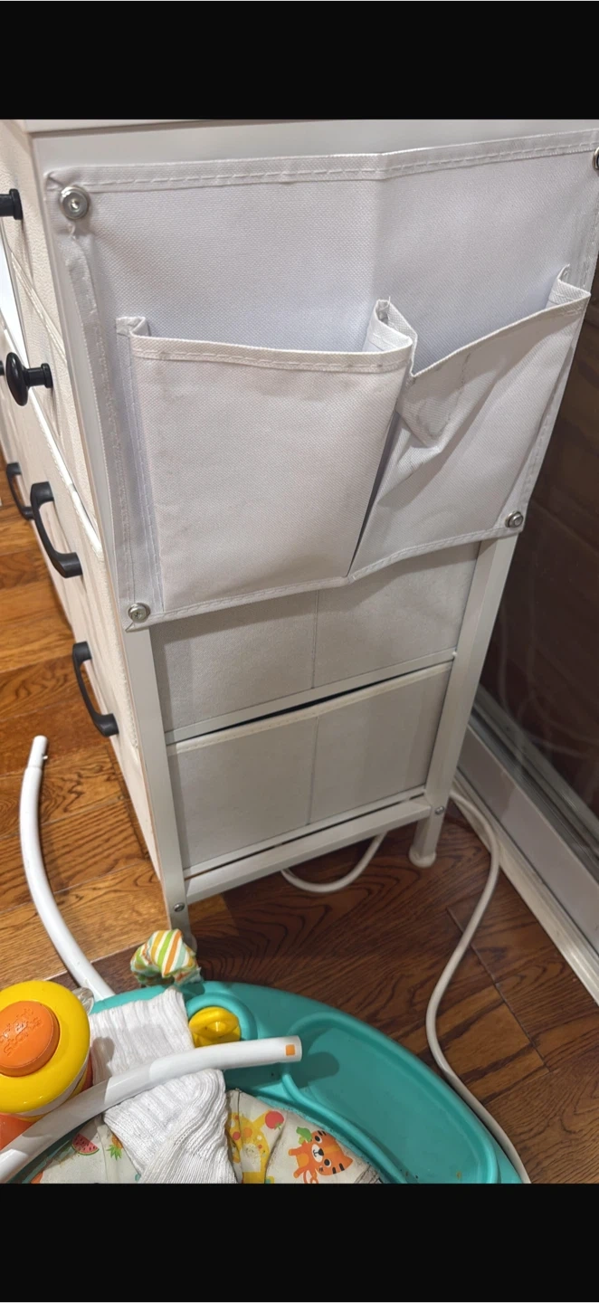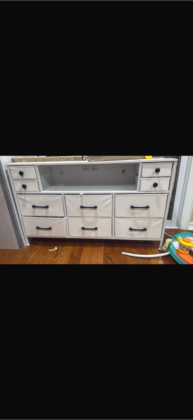This dresser features multiple fabric drawers for storage. It includes a built-in power strip with two outlets and two USB ports. The frame is white metal with black drawer pulls.