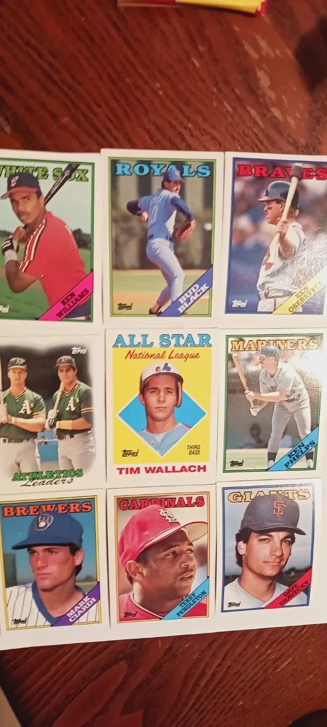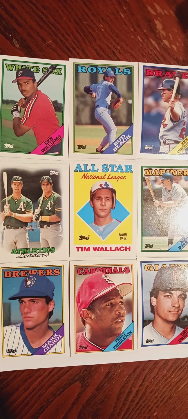 This listing includes a collection of 9× Topps 1988. Major League baseball cards. Featured players include Ken Williams, Bud Black, Tim Wallach, Mark McGwire, and others. Cards are from various teams like the White Sox, Royals, Braves, Athletics, Mariners, Brewers, Cardinals, and Giants. The cards are from the 1988. There are no duplicate cards in this lot. EXCELLENT MINT CONDITION..ALL MY PRICES ARE NEGOTIABLE !!