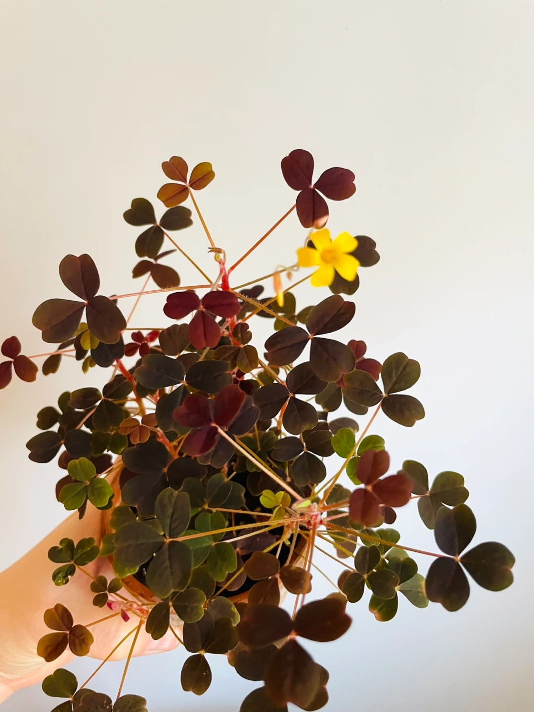 Pretty purple shamrock plant with heart-shaped leaves and a delicate yellow flower. It's currently in a small terracotta pot. This plant adds a lovely touch of colour to any indoor space!