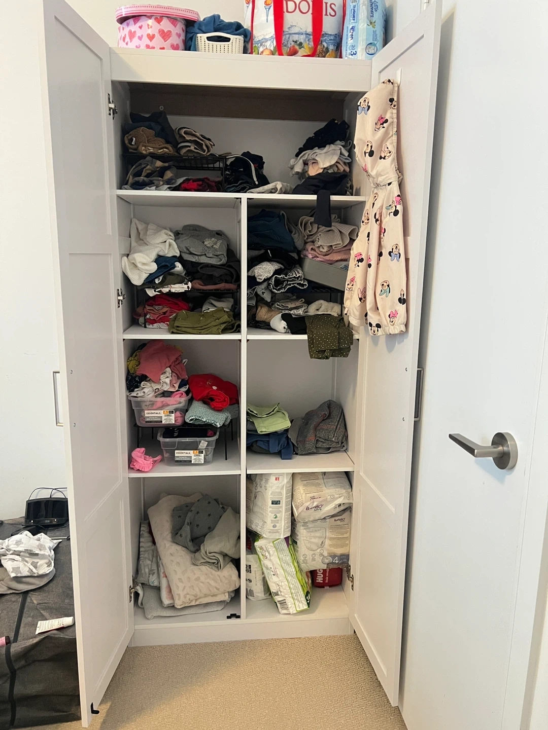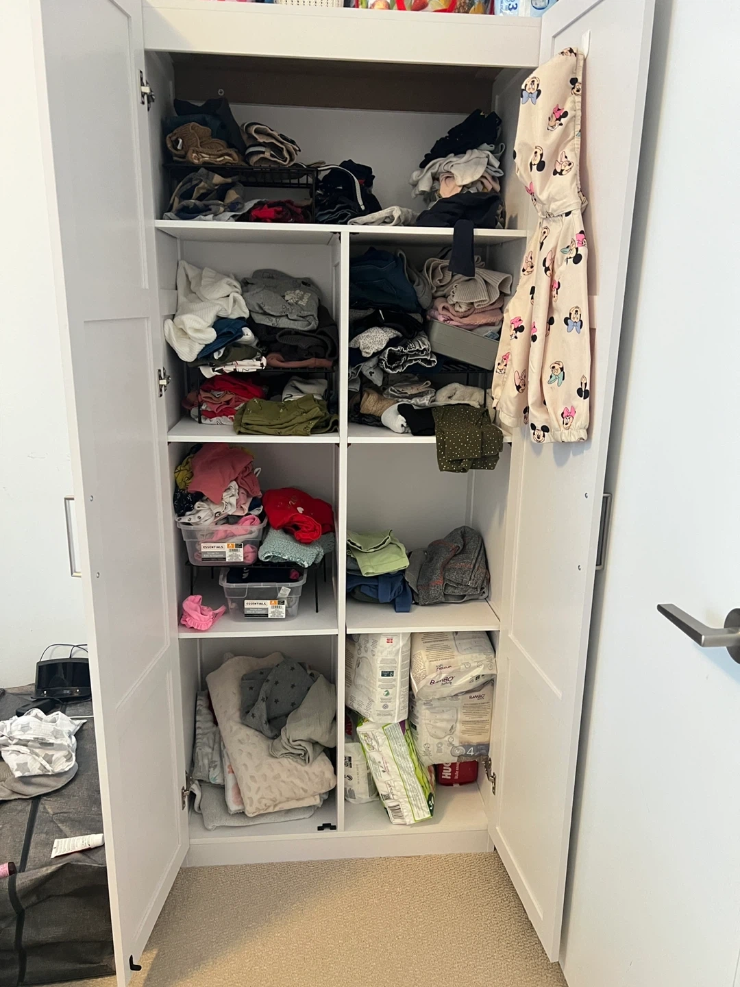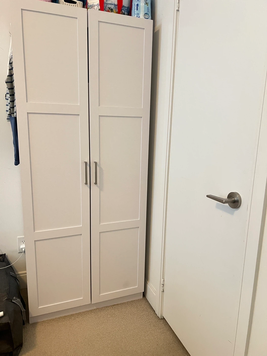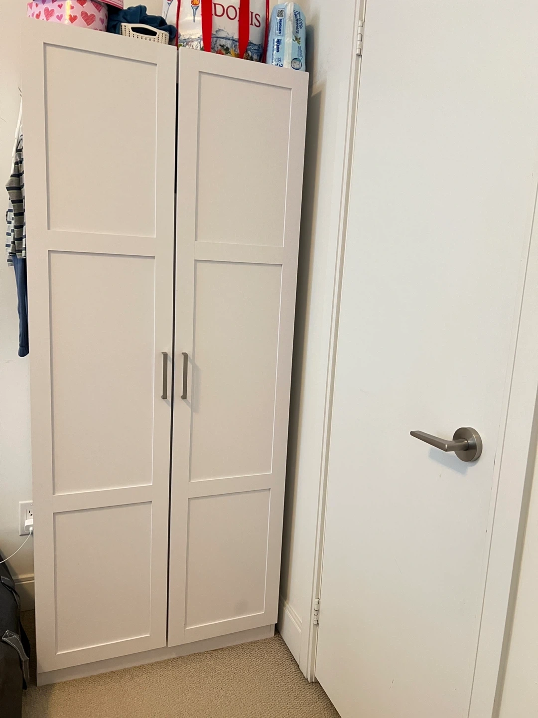 A tall, white storage cabinet with two doors. It has multiple adjustable shelves and compartments inside for organizing clothes and other items. The exterior is a light, neutral colour.