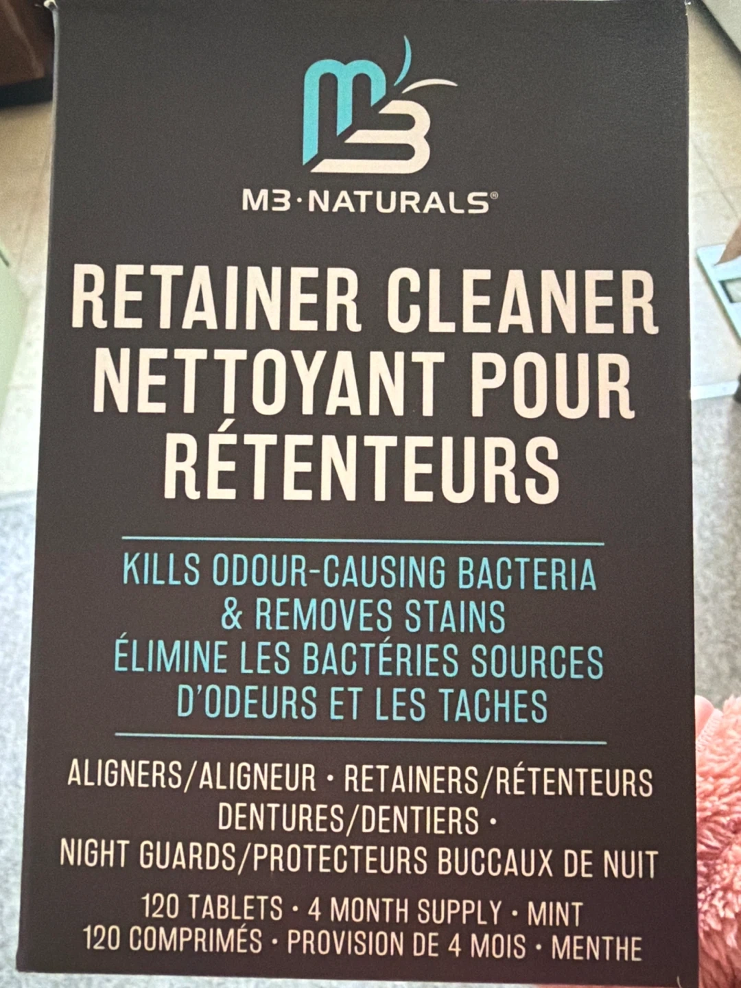 This box contains M3 Naturals Retainer Cleaner tablets. It's designed to kill odour-causing bacteria and remove stains. Includes 120 tablets, a 4-month supply. I used one tablet and it’s not for me .