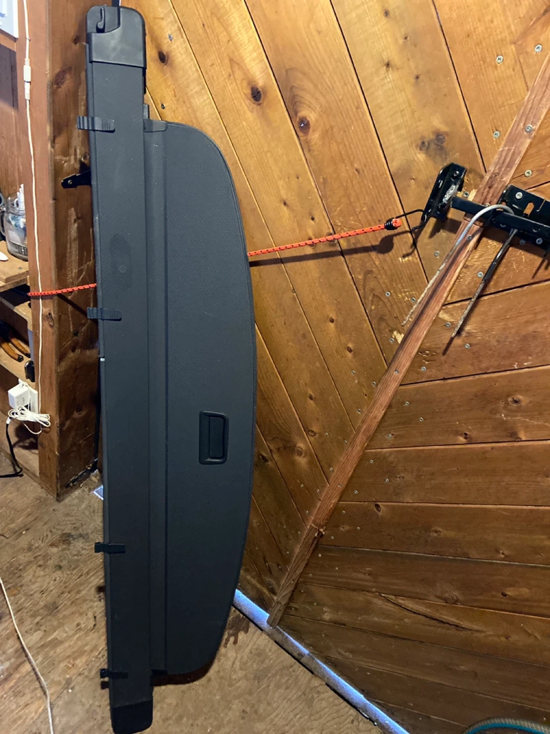 Retractable cargo cover for a car. Keeps your trunk tidy and items out of sight. Black fabric with a pull handle. It's easy to install and remove.