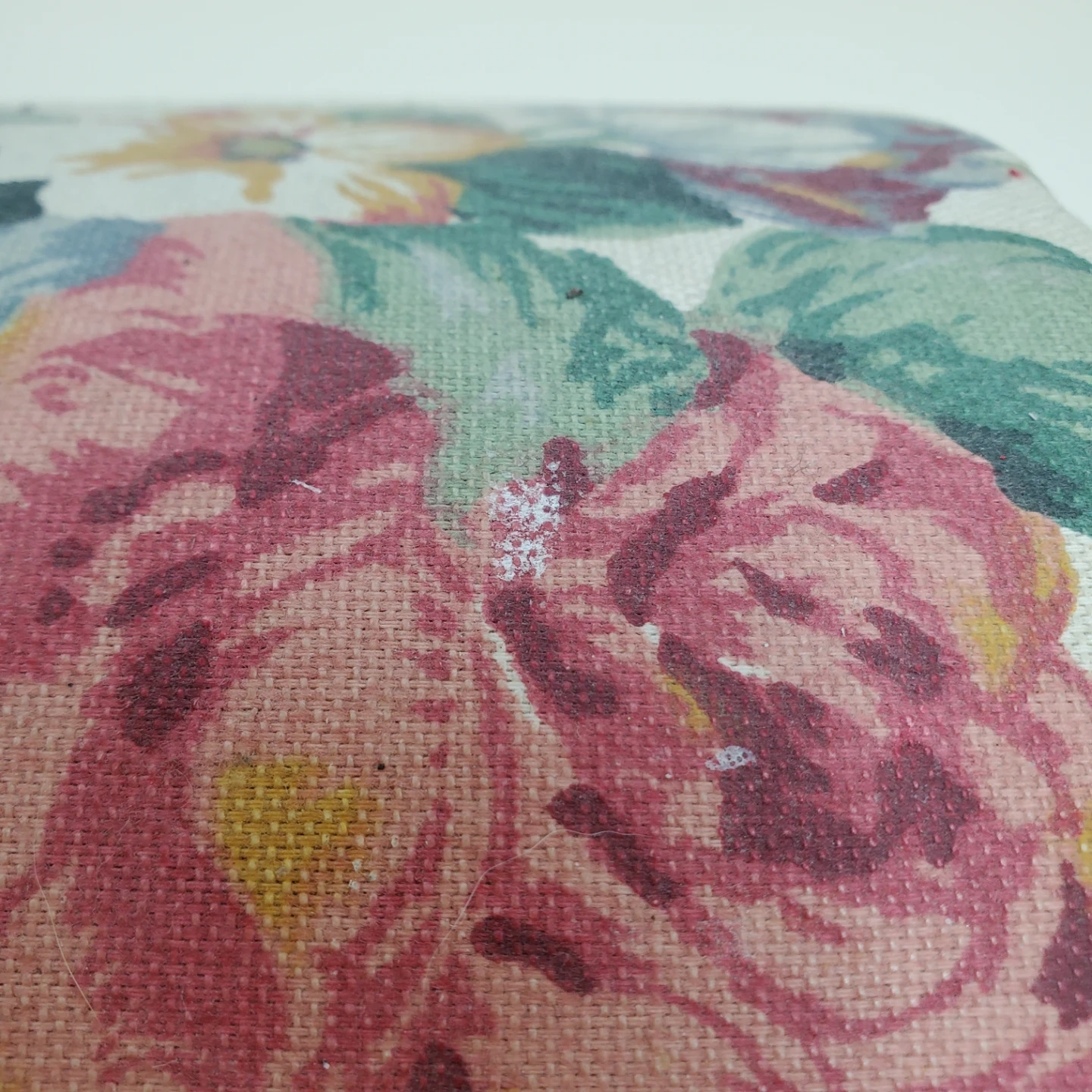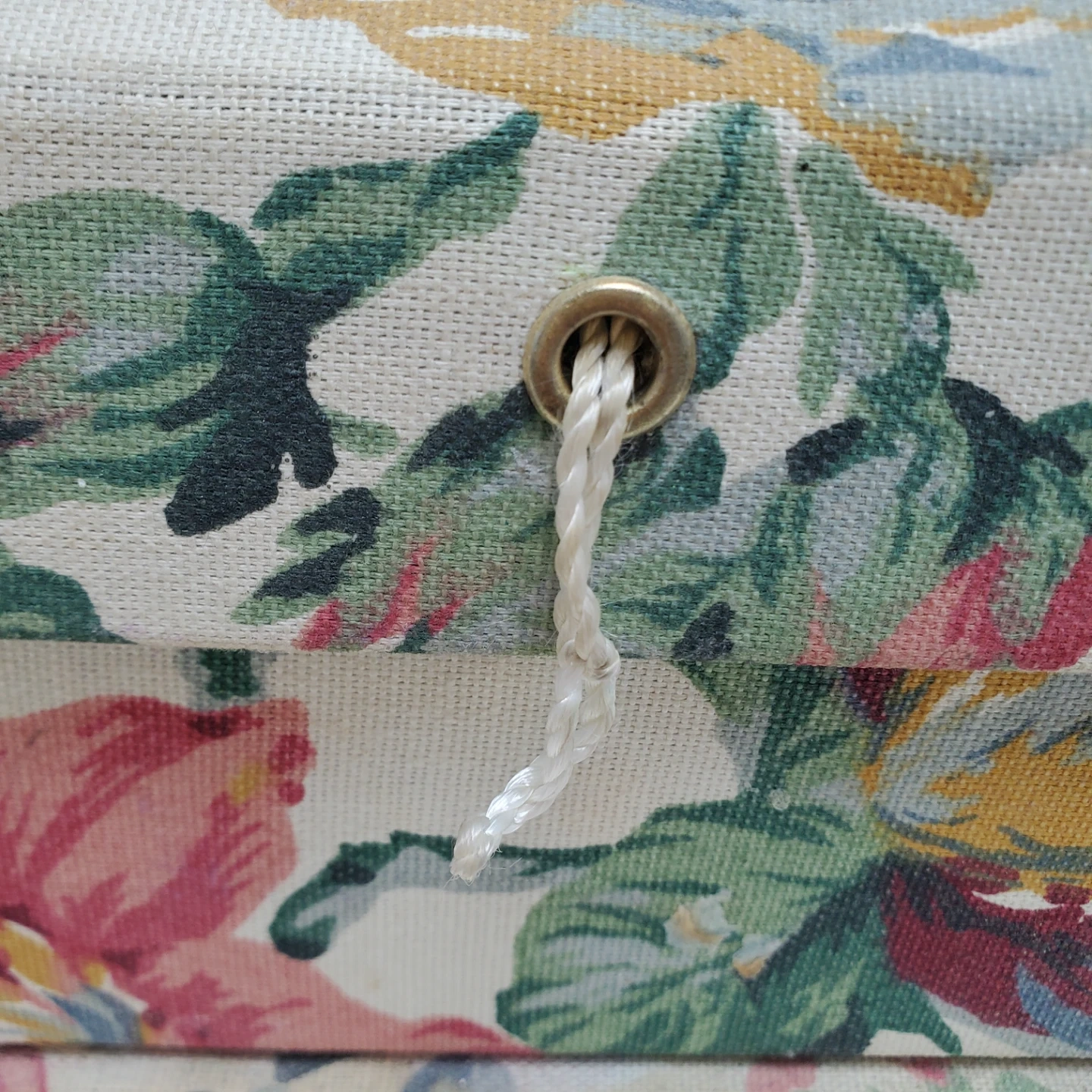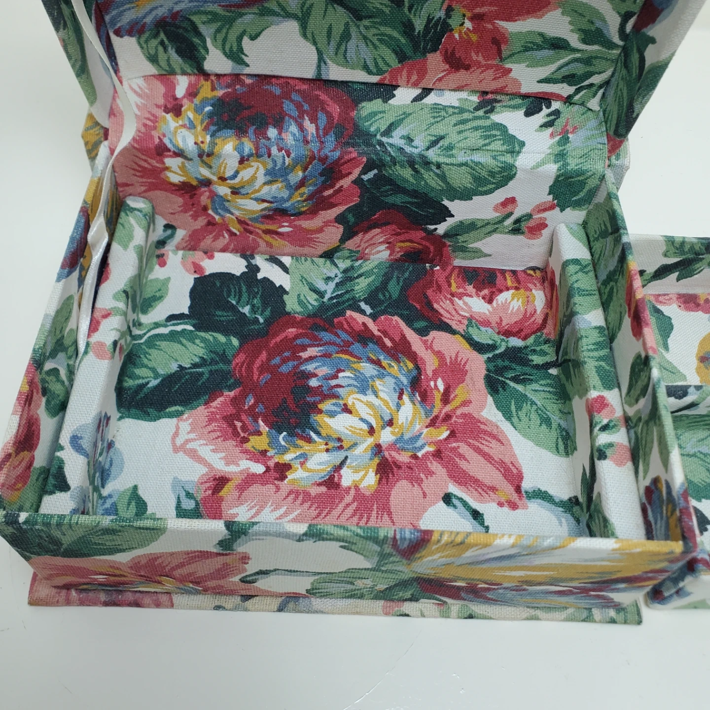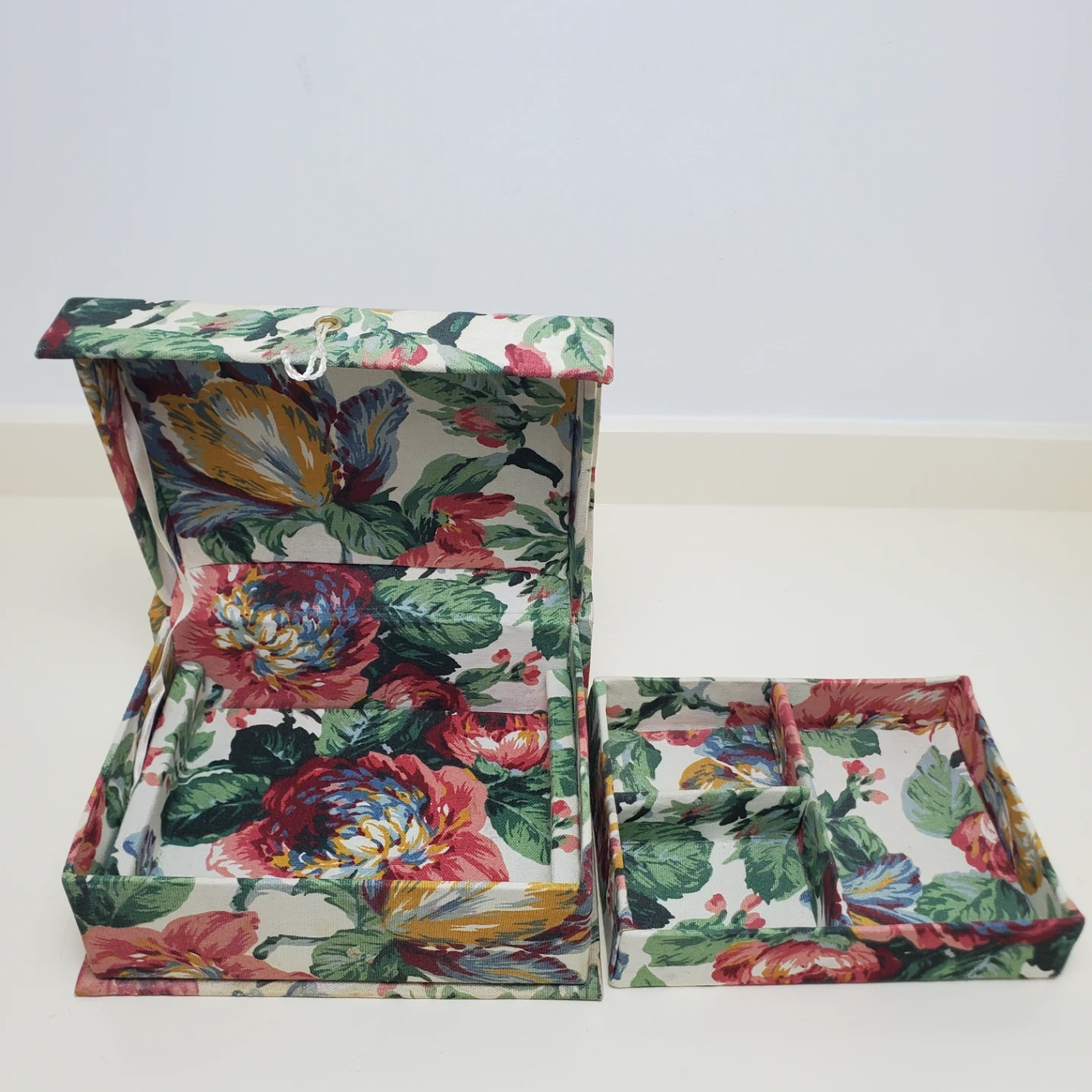 A fabric storage box with a colourful floral pattern. It has multiple compartments inside for organizing small items. The box is hinged and includes a pull string for closure. Missing one ribbon and has signs of use.