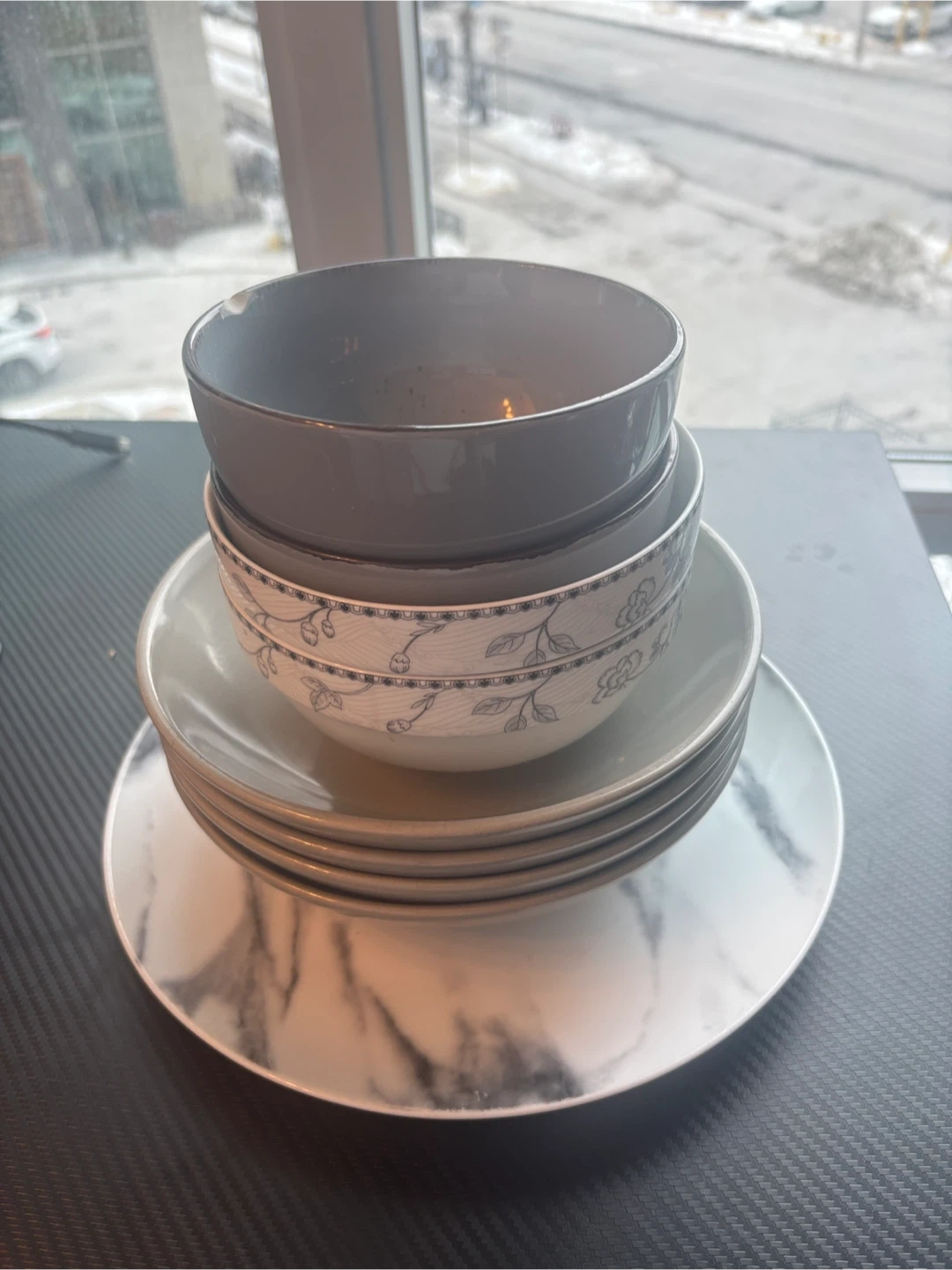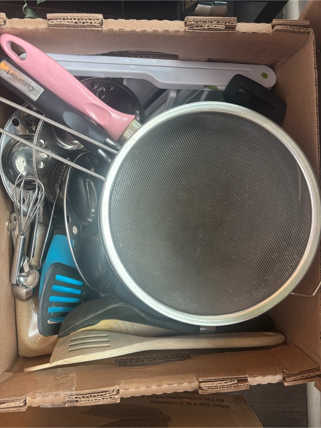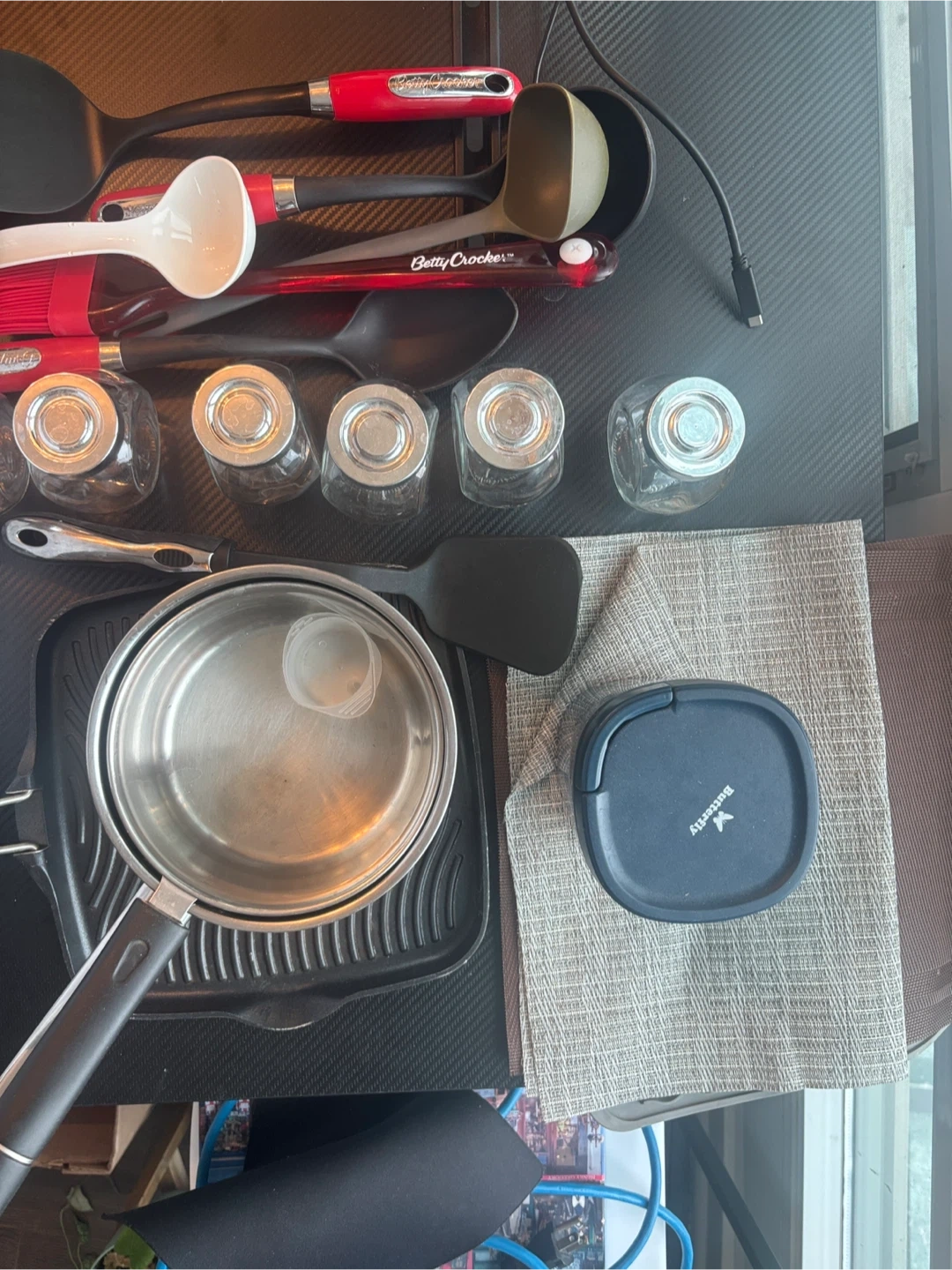 A collection of kitchen tools including a small saucepan, various spatulas, whisks, and measuring spoons. Also includes a set of ceramic bowls and plates. Some items are branded Betty Crocker and Cuisinart.