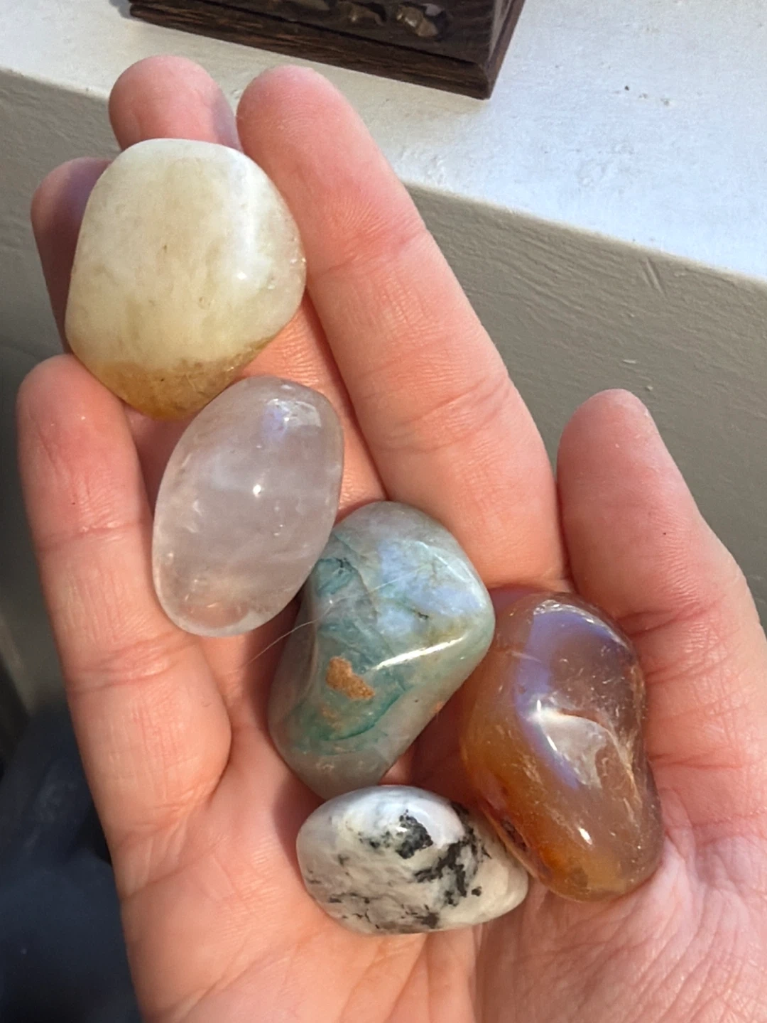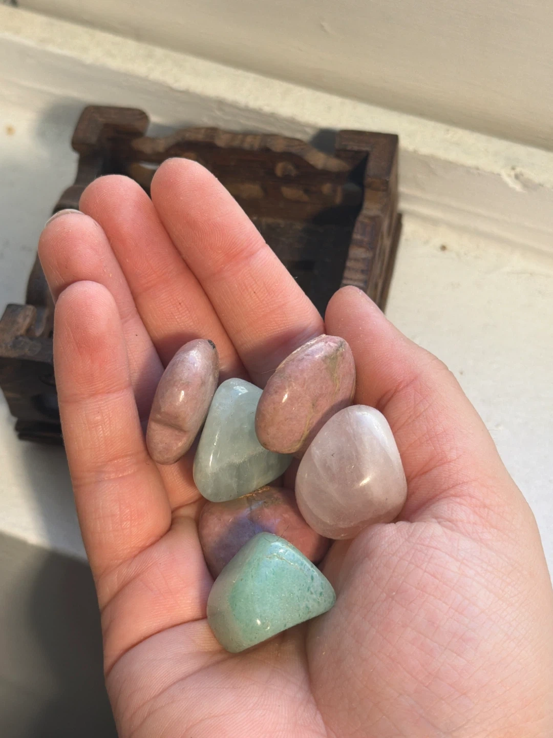 Small, intricately carved wooden box filled with various polished gemstones. The wood has a dark, rich finish and features detailed scrollwork on its sides.