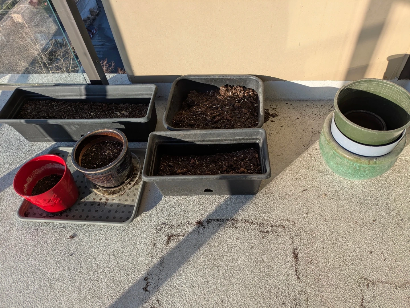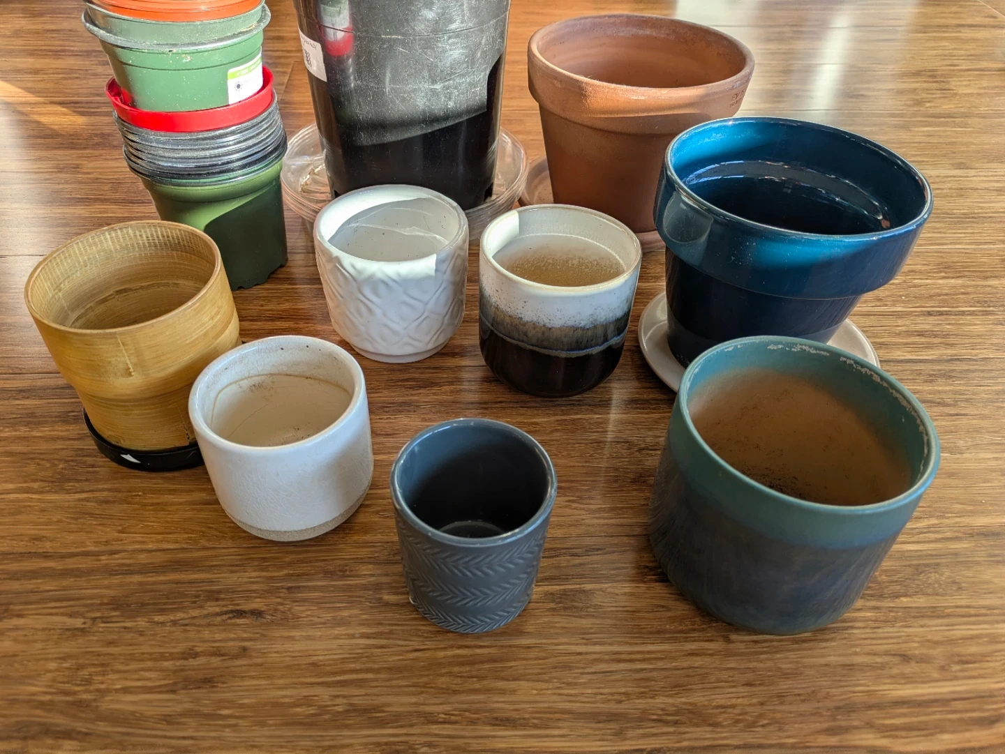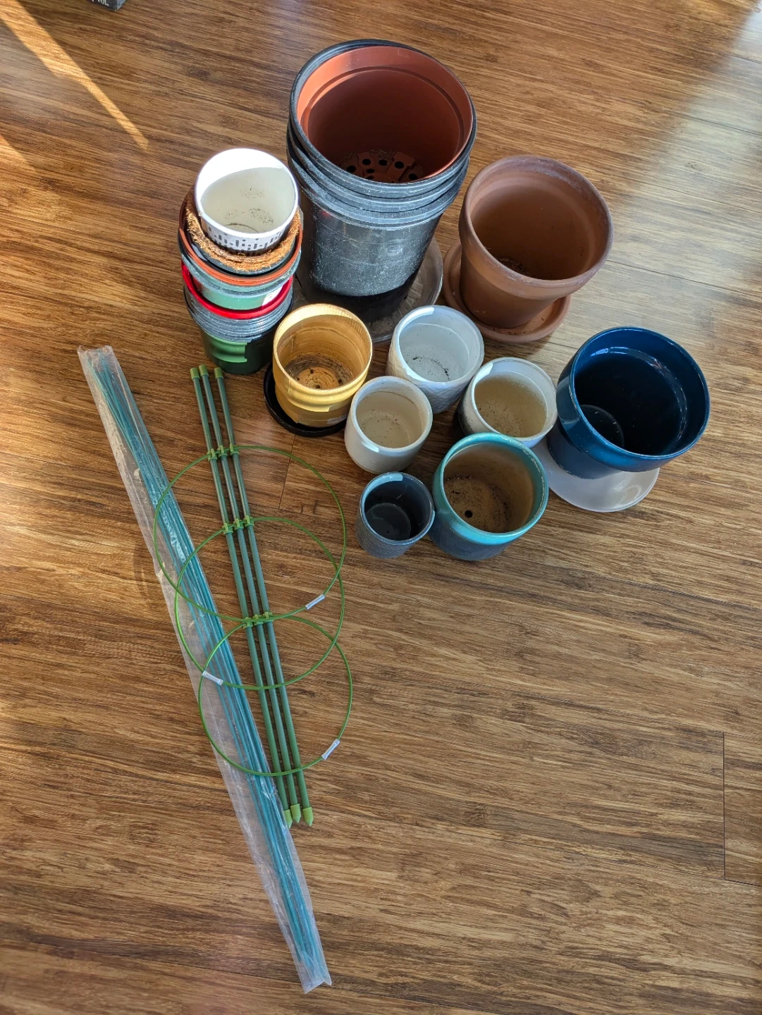 A collection of various plant pots in different sizes and materials, including plastic, ceramic, and terracotta. Also includes garden stakes for plant support. These pots are ready for your next gardening project!