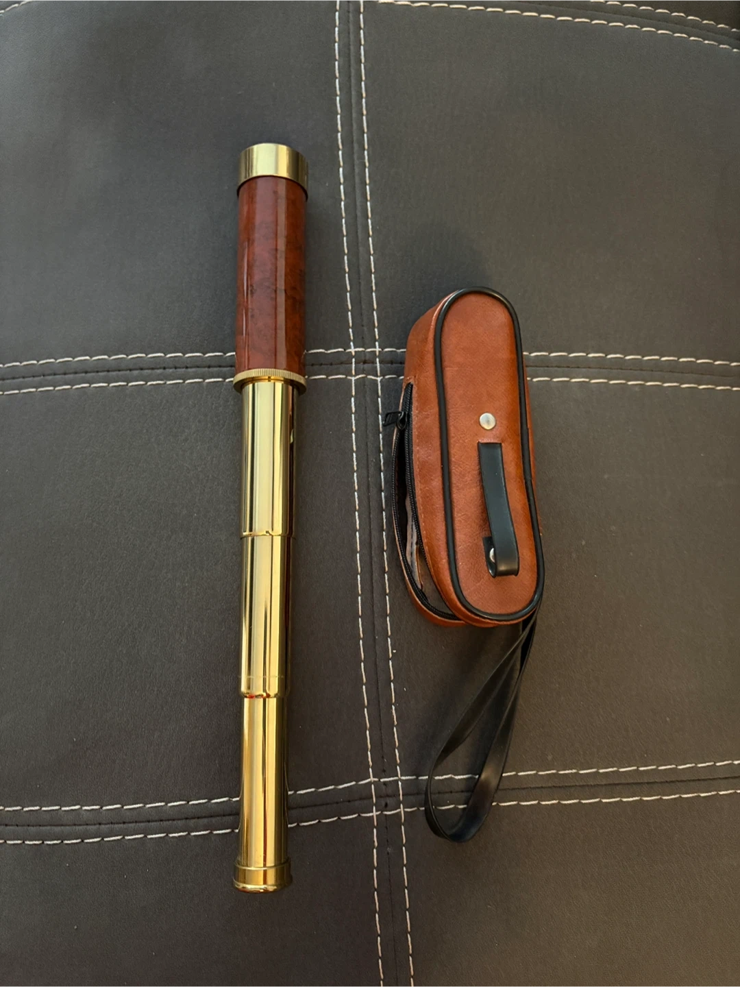 This is a functioning brass telescope with a wooden-look finish. It comes with a brown faux leather carrying case with a strap. Perfect for your inner pirate or adventurer. It’s in great condition.
