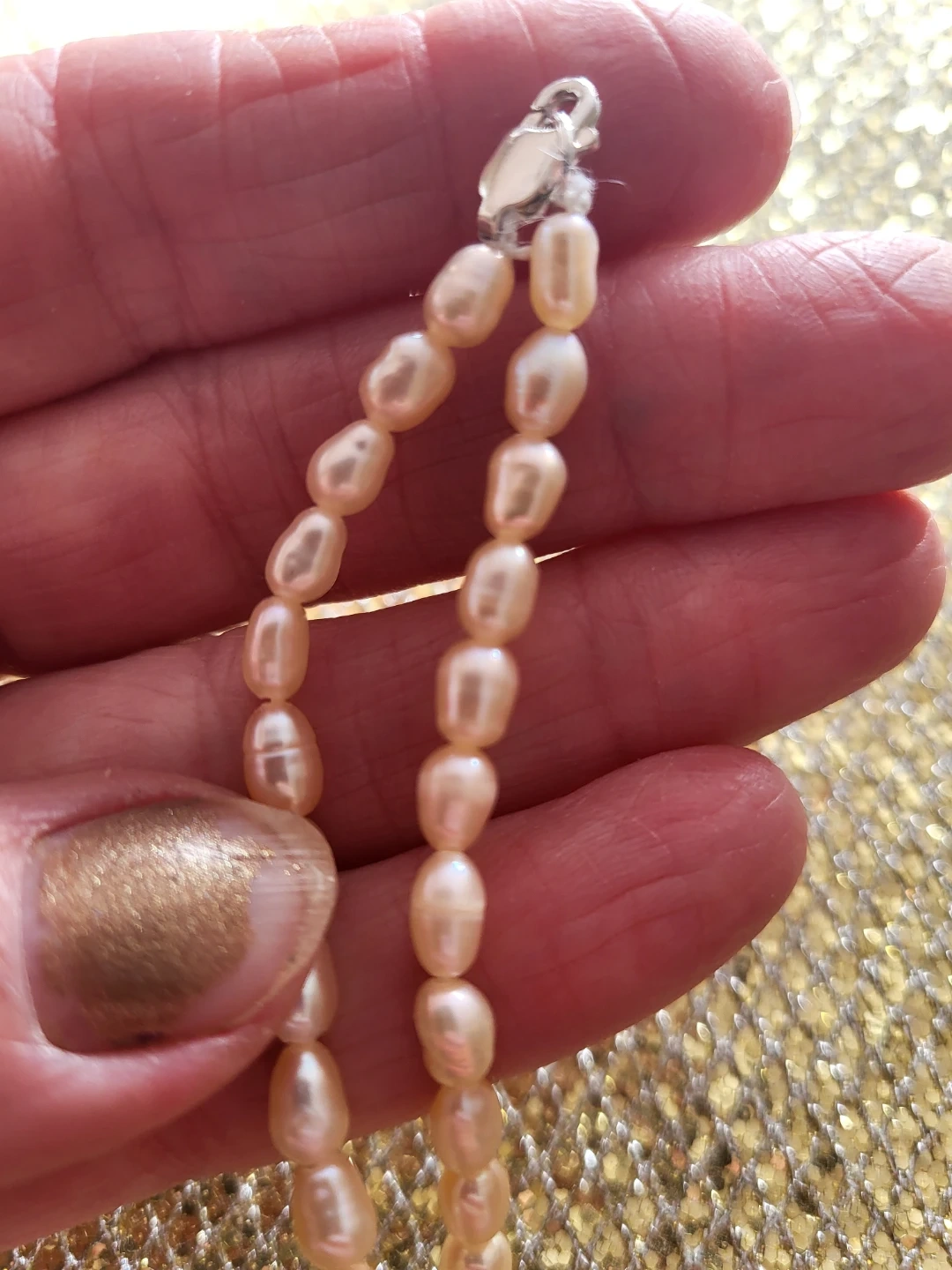 This is a delicate necklace strung with lovely oval-shaped freshwater pearls. It's a classic accessory that'll go with almost anything. The clasp is a simple silver-tone metal.