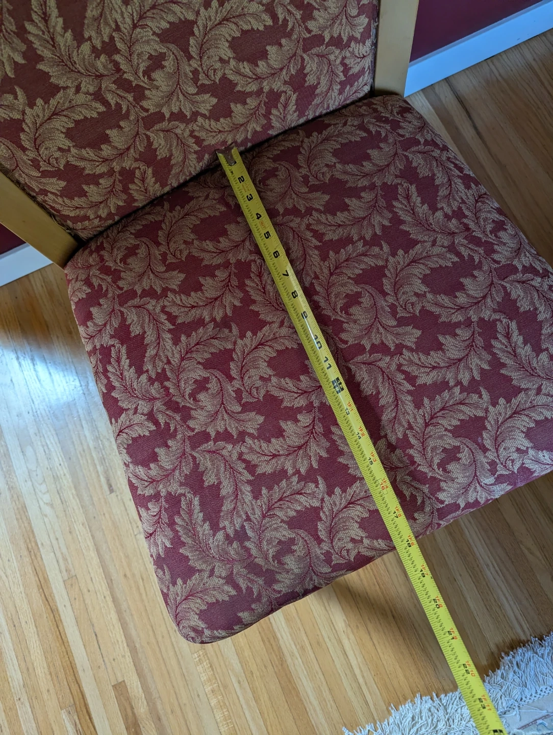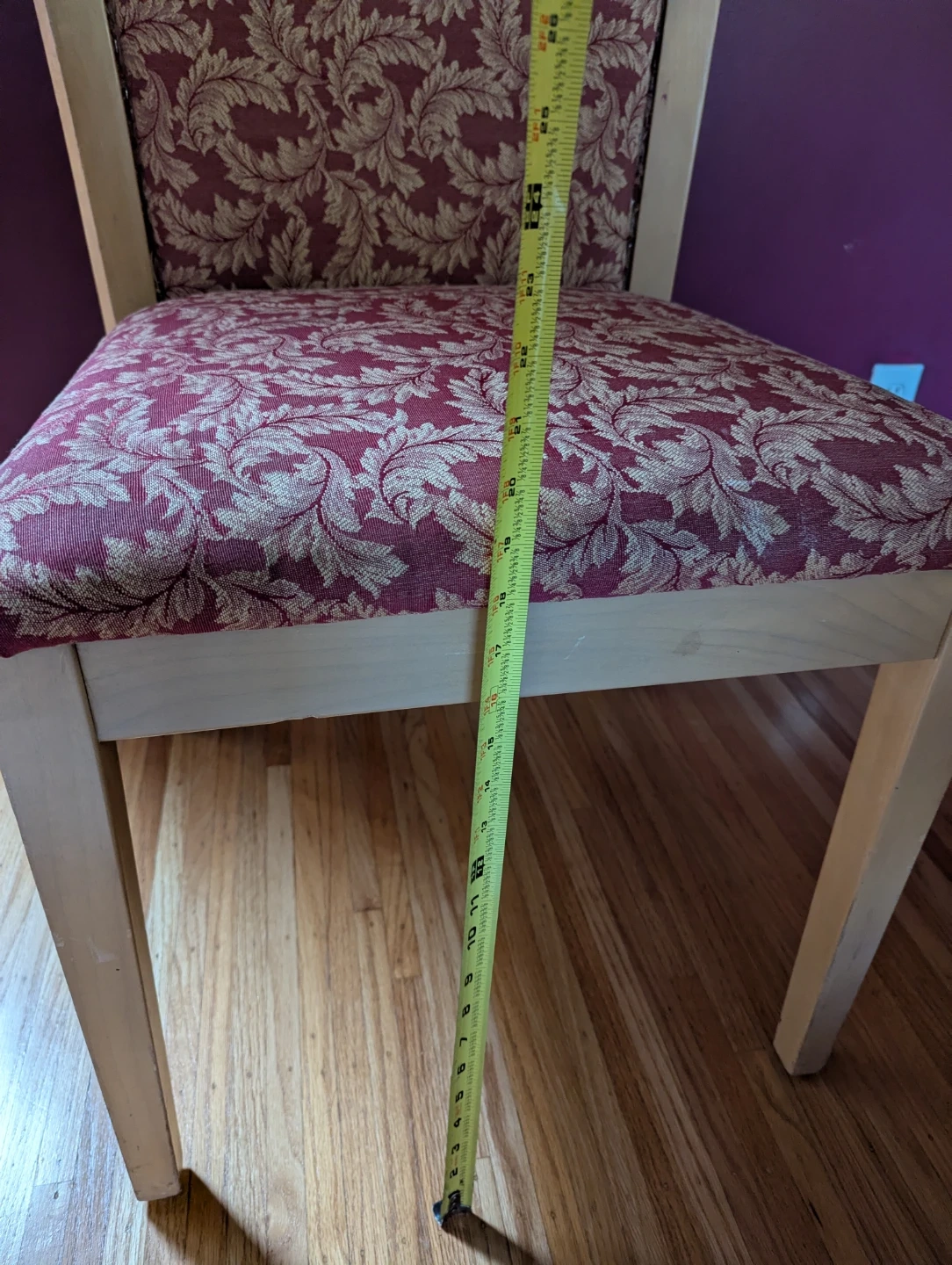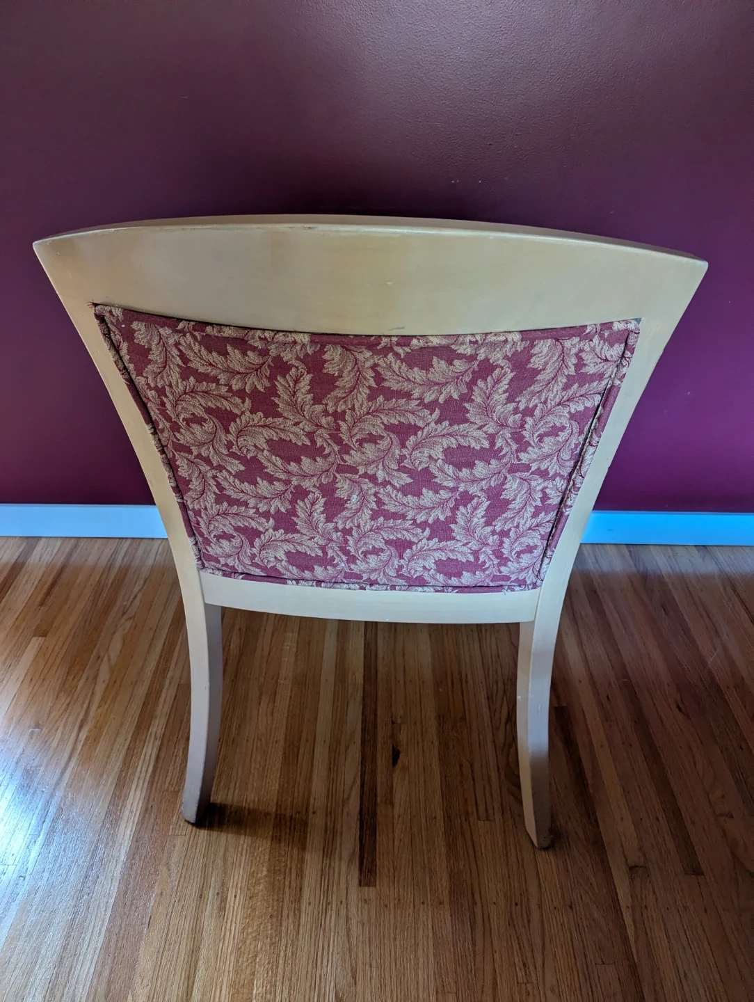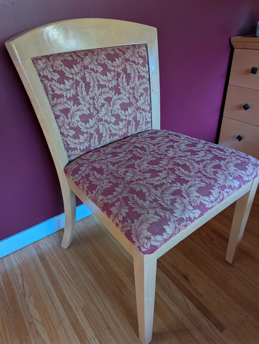 A comfortable dining chair with a light wood frame and upholstered seat and back. The fabric features a maroon and gold floral pattern. Seat width is approximately 19 inches. Both chairs are sturdy, clean, and great as dining or accent pieces.