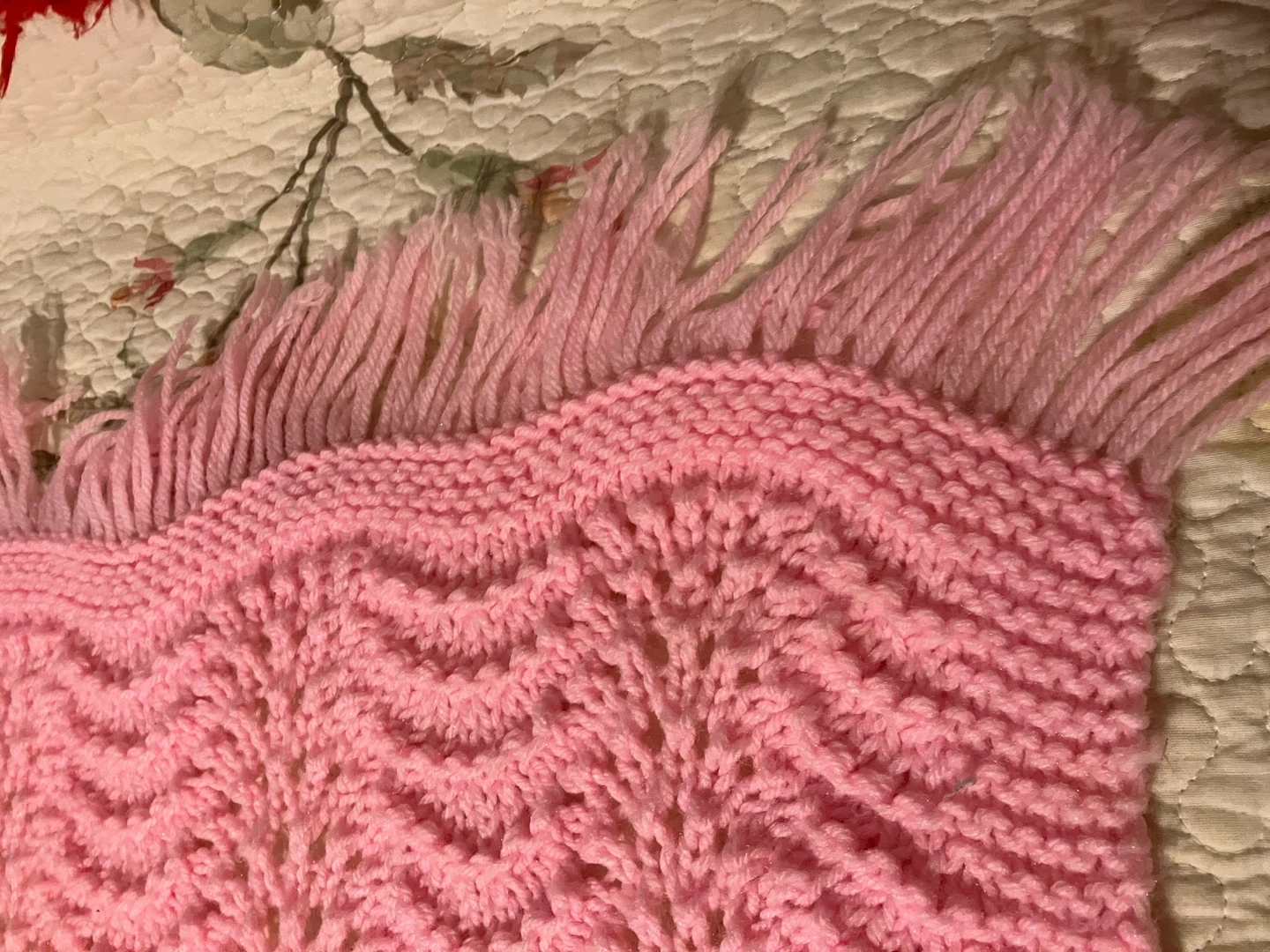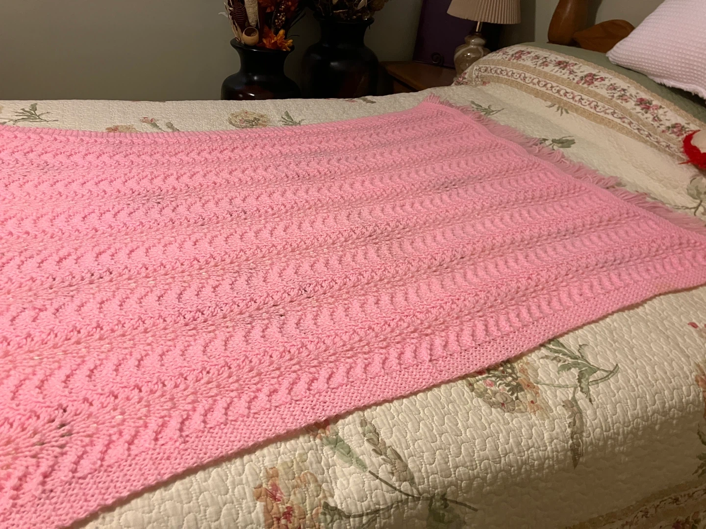 soft pink knitted throw blanket with a beautiful open-knit pattern and fringe on one edge. It's perfect for adding a cozy touch to your sofa or bed or baby’s room