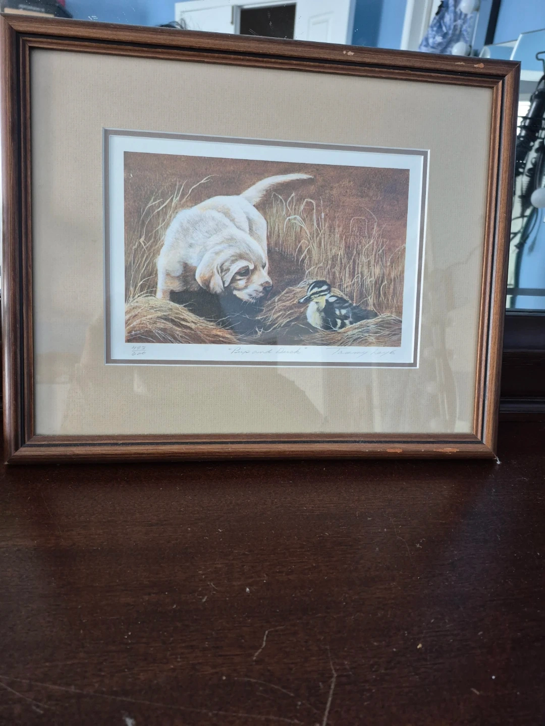 Framed print titled "Pup and Duck" by artist Tommy Lamb. Numbered 447 of 3000. Features a Labrador puppy and a duckling. Wooden frame.