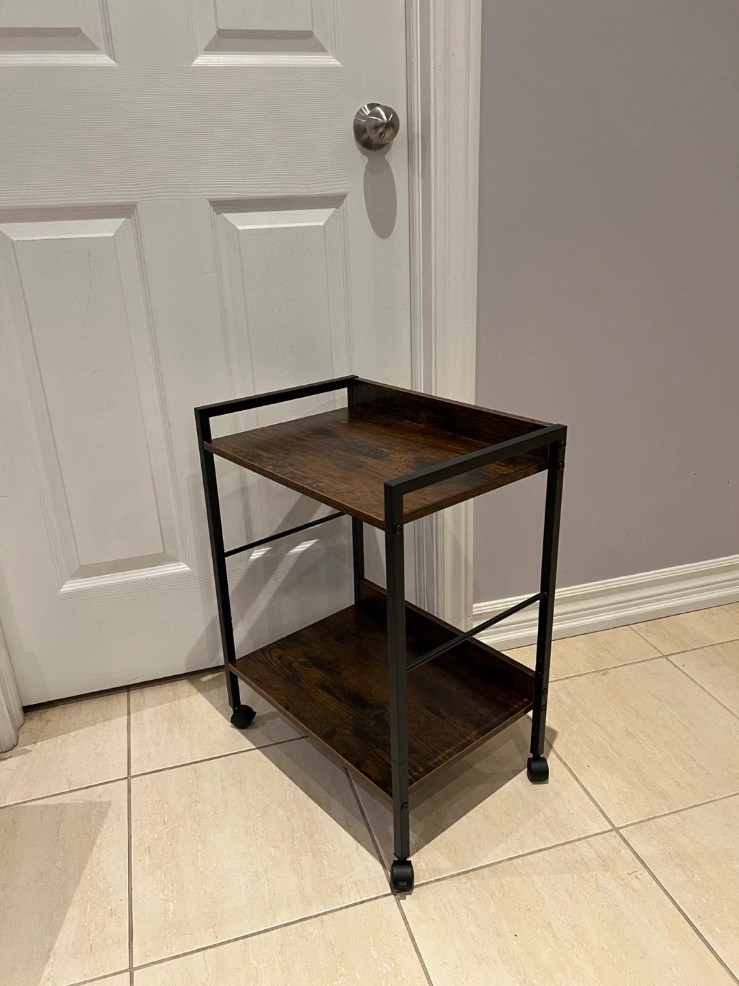 This rolling cart has a wood finish and two shelves. It's on wheels for easy movement. The cart is approximately 24 inches tall. It's useful for organizing small spaces or as a serving cart.