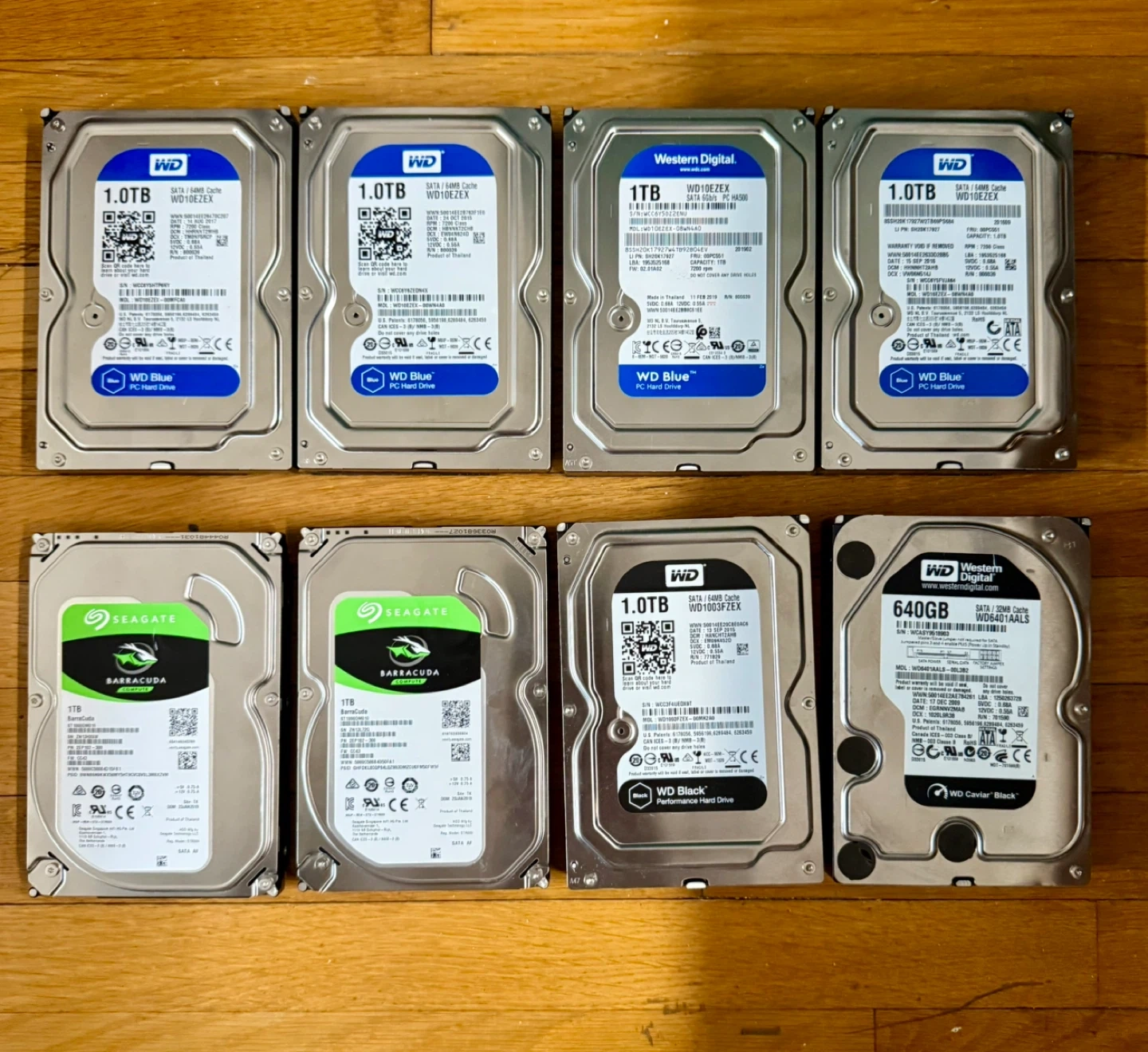 Selling a lot of 5 Western Digital 1TB Blue PC Hard Drives, 2 Seagate 1TB BarraCuda Hard Drives, and 1 Western Digital 640GB Caviar Black Hard Drive. Capacities range from 640GB to 1TB with SATA interfaces. All drives are 3.5 inch internal hard disk drives.
