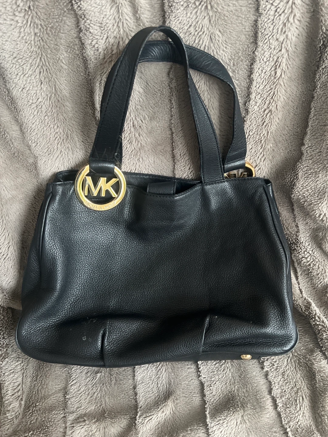 This is a black leather tote bag by Michael Kors. It features gold-tone hardware and MK logos on the handles. The textured leather is durable and stylish. It's a classic accessory for everyday use.