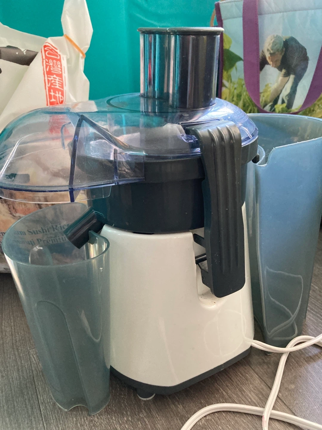 It is all washed and clean. Oster juicer, white and clear plastic. Includes pulp collector and juice pitcher.
