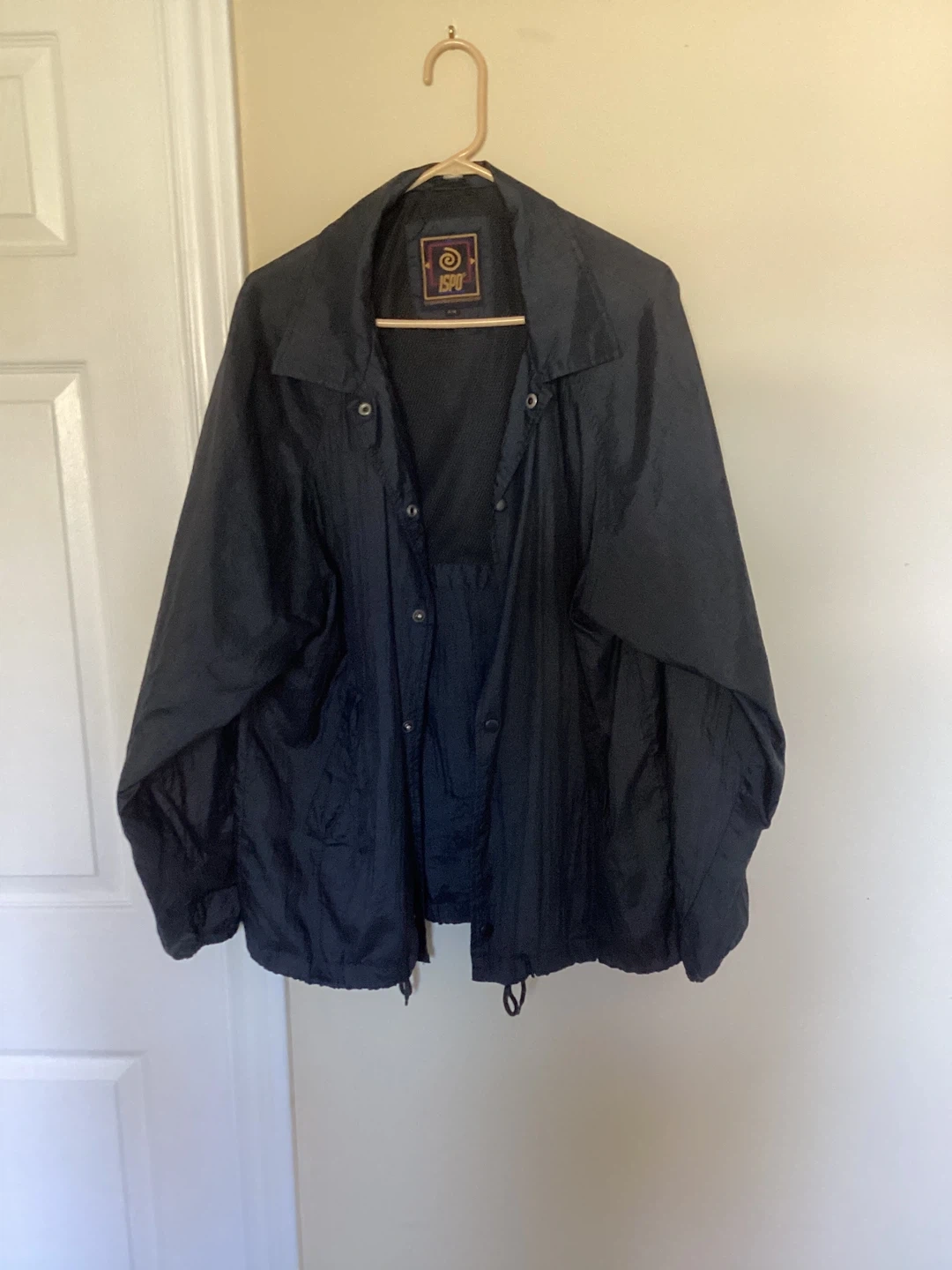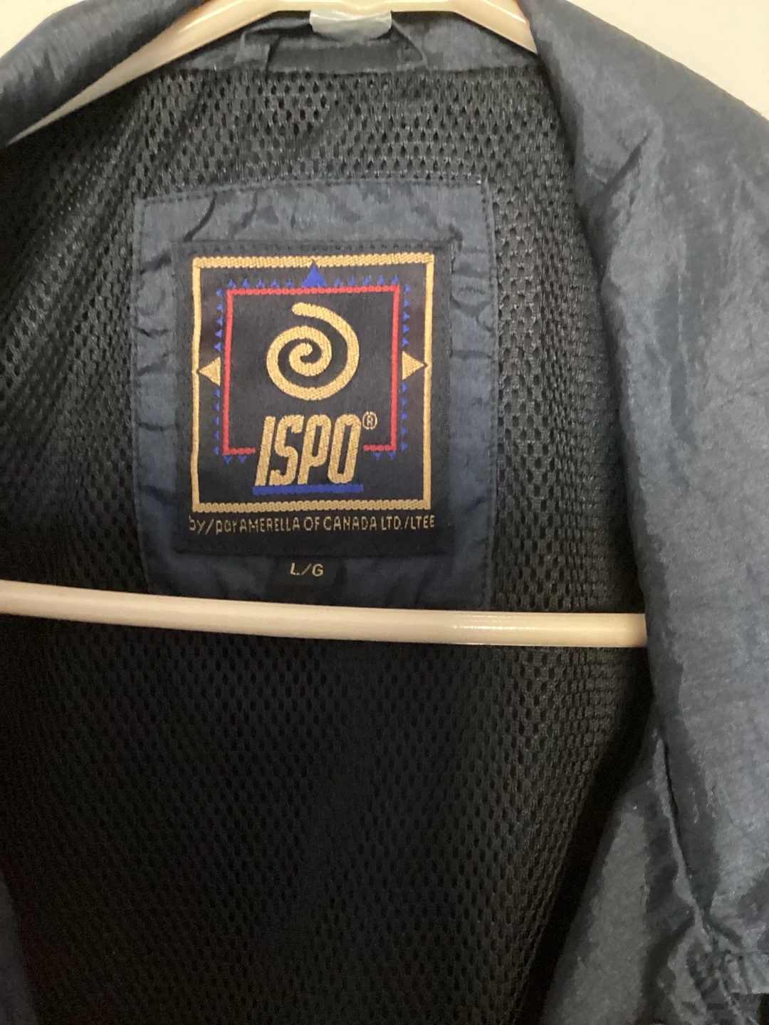 This ISPO black jacket is a size L/G. It is like new never wore. It's made of a lightweight, possibly nylon material with a mesh lining. Features snap button closure and a drawstring hem. Perfect for casual wear or light outdoor activities.clean environment no smoking no pet.