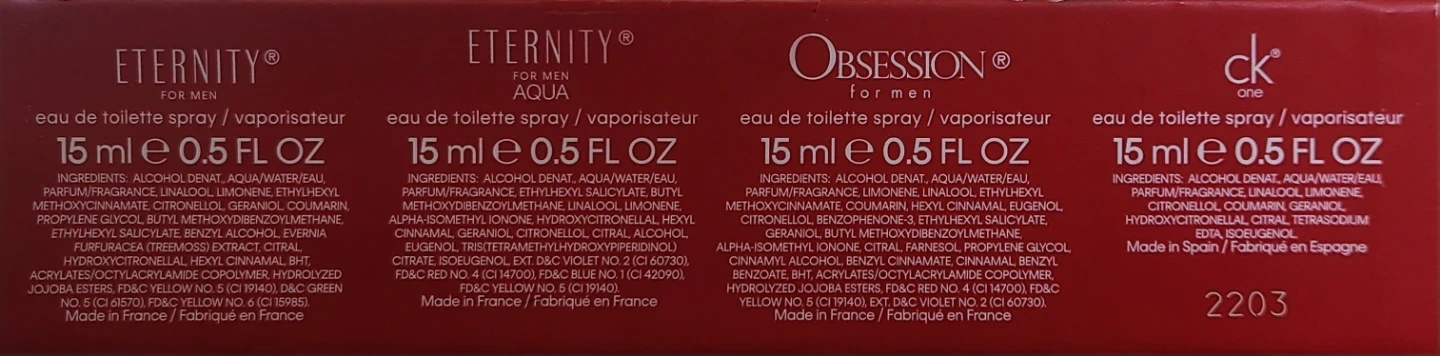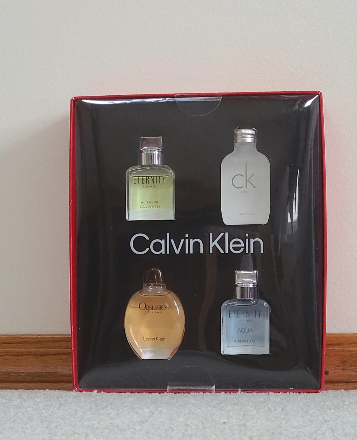 This Calvin Klein gift set features four miniature men's fragrances. It includes Obsession for Men, Eternity for Men, Eternity for Men Aqua, and CK One.