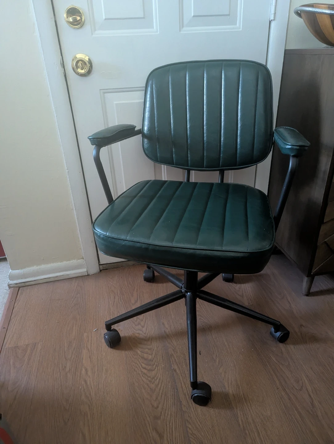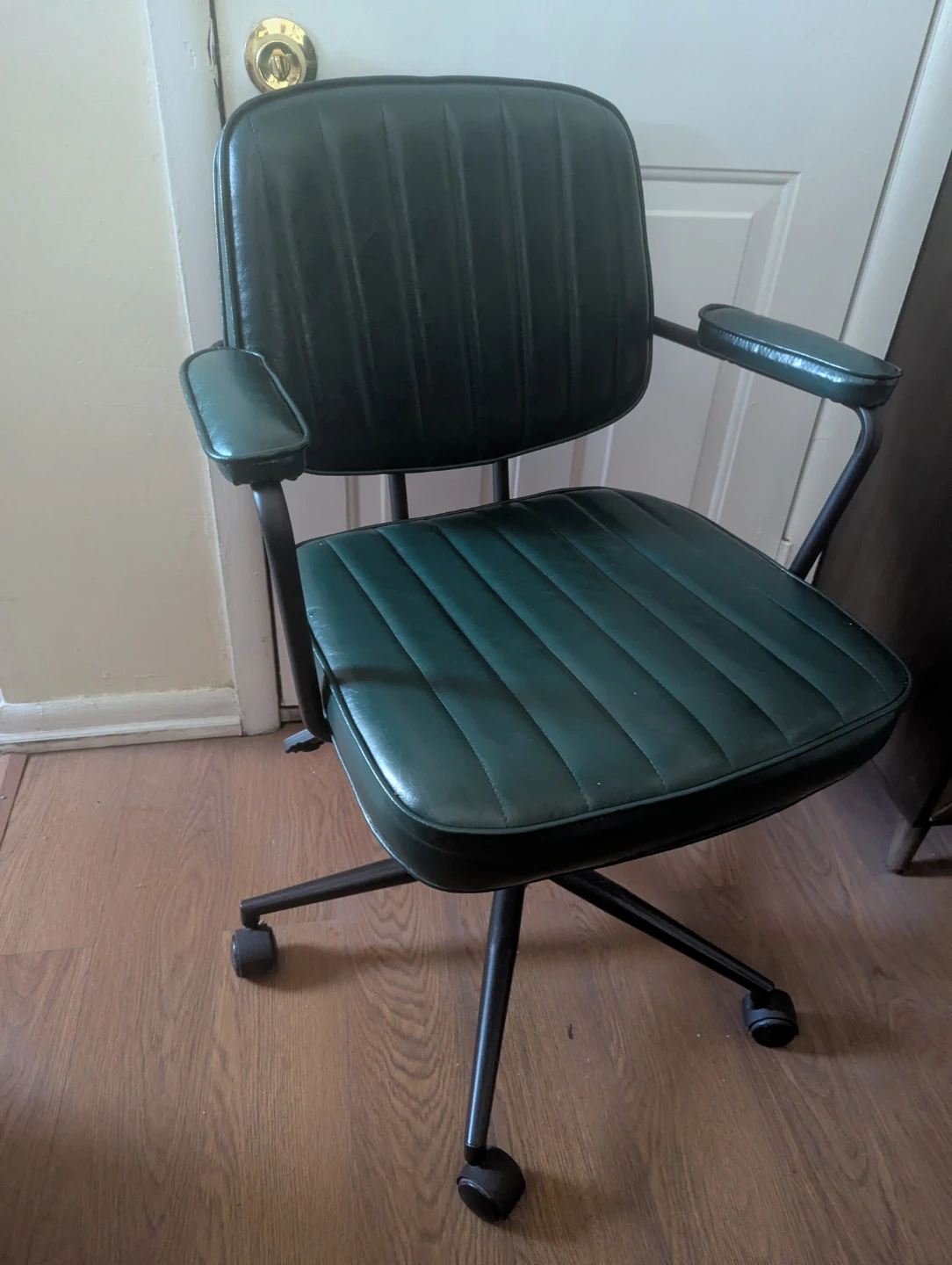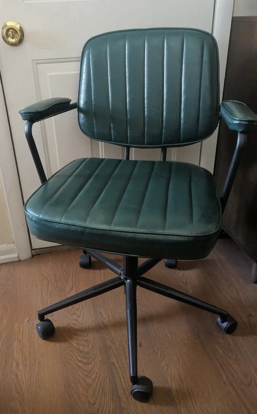 This is a green leather office chair for ladies.. It features a padded seat and back with vertical channel stitching. The chair has a black metal base with casters and armrests. Its dark green.