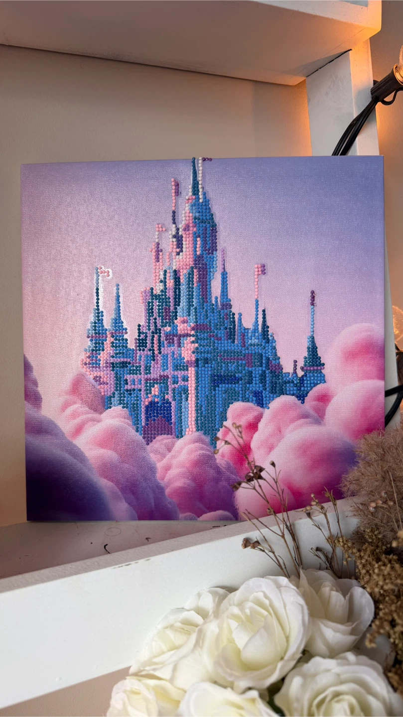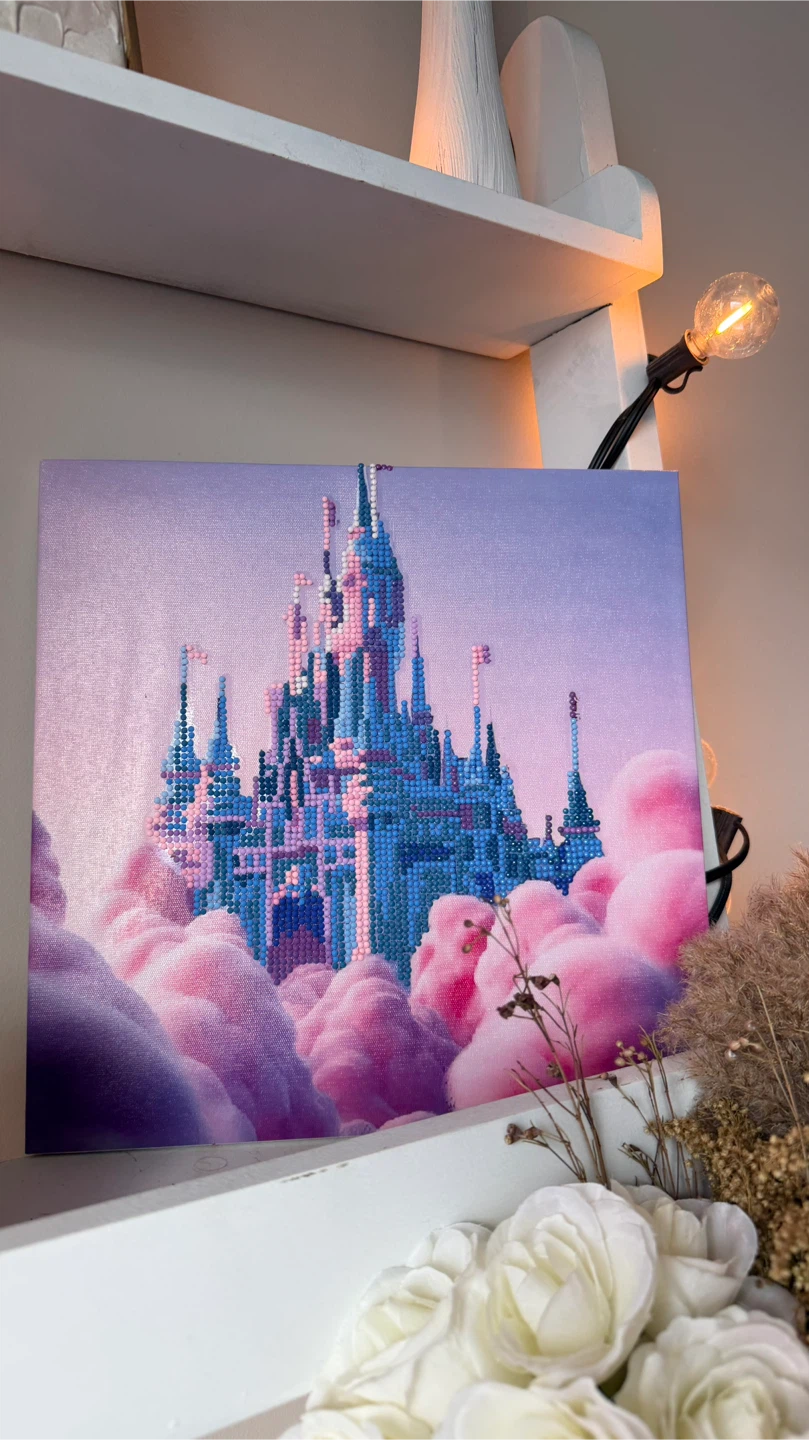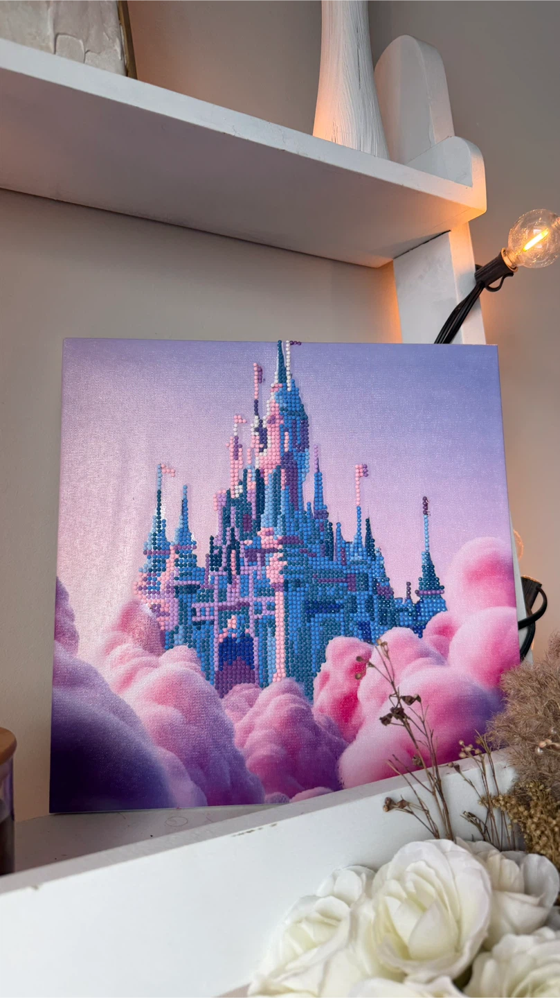 This diamond painting features a vibrant castle nestled amongst fluffy pink clouds. It's a beautiful piece of art with intricate details. This would make a lovely addition to any room, especially for Disney enthusiasts!