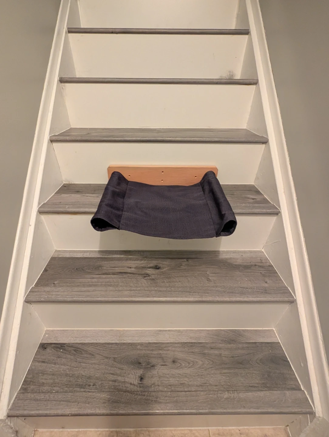 This wall-mounted cat hammock is made of dark fabric with a wooden base. It's designed to attach to a wall or stairs for your feline friend to relax on. The dark fabric is durable, and the wooden base provides stability. (I didn't use this after purchase, you will need to get screws)
