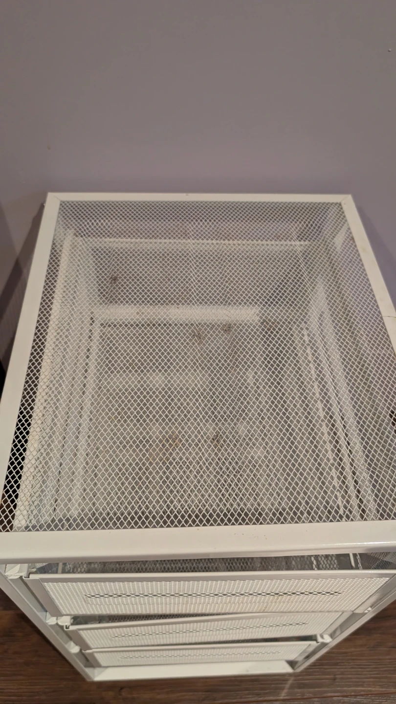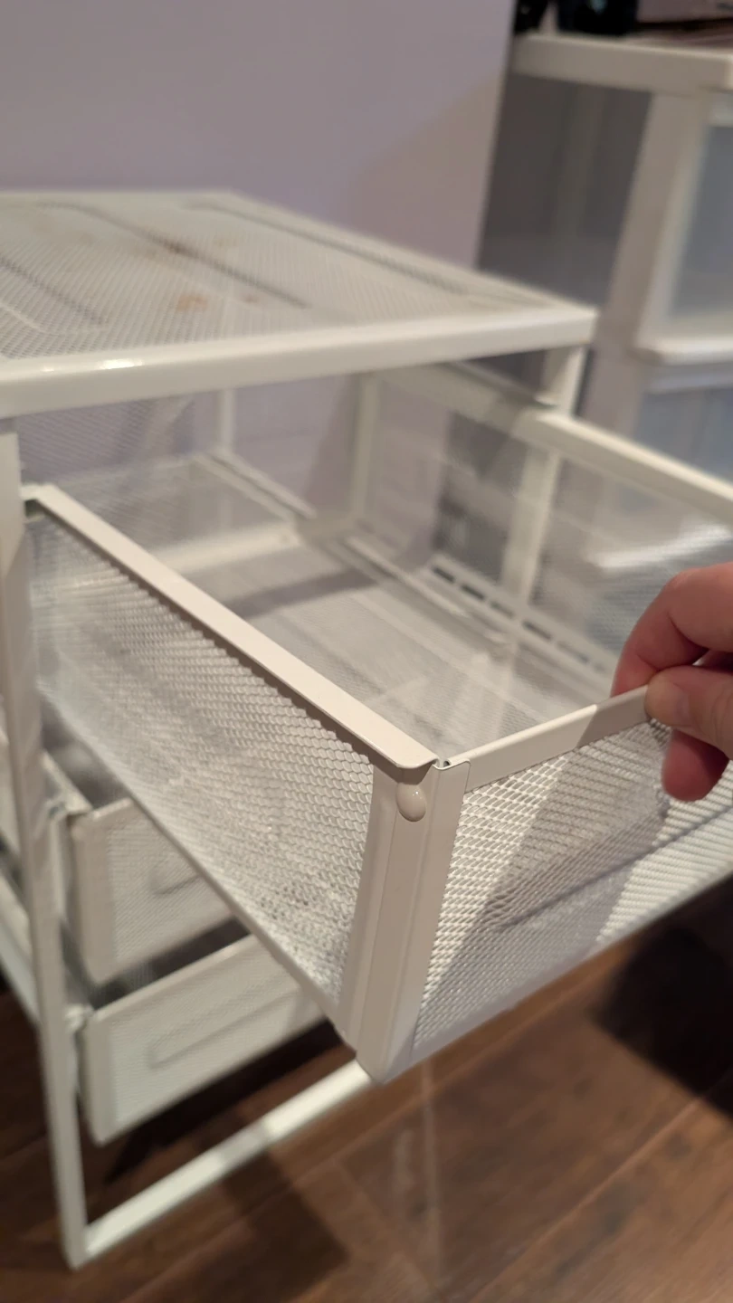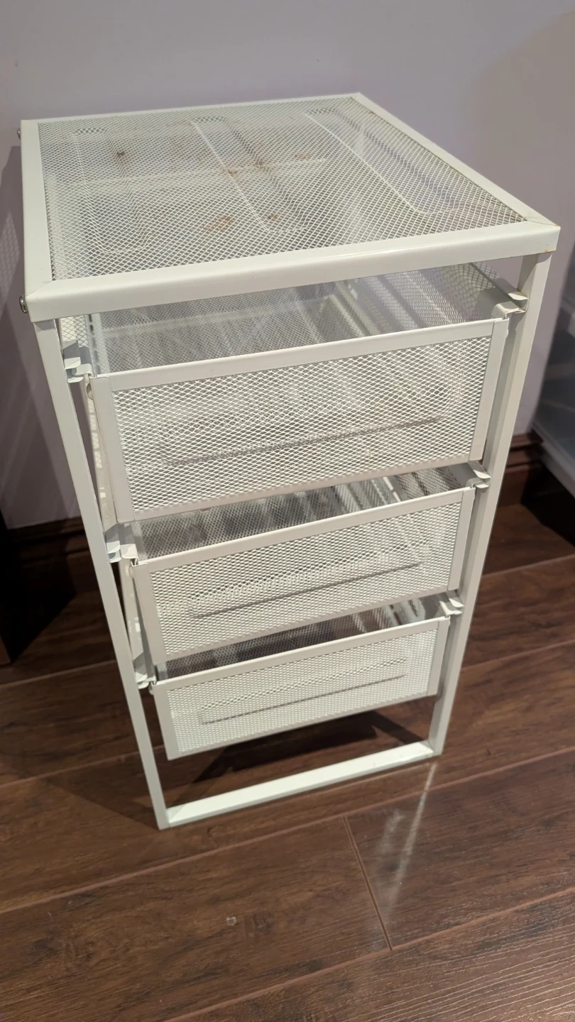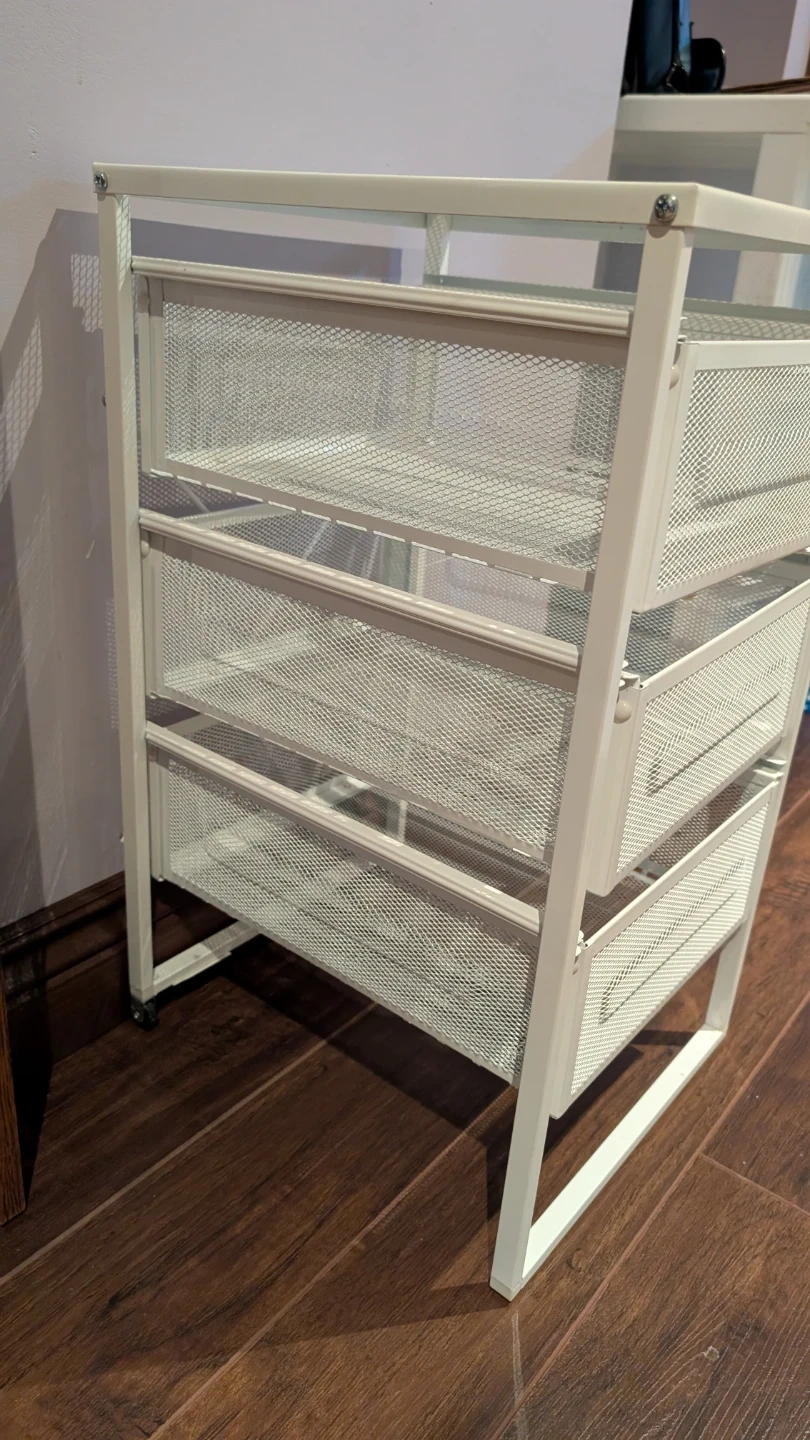 A white mesh storage cart with three drawers. It's made of metal with a mesh design. Wheels on back of legs.