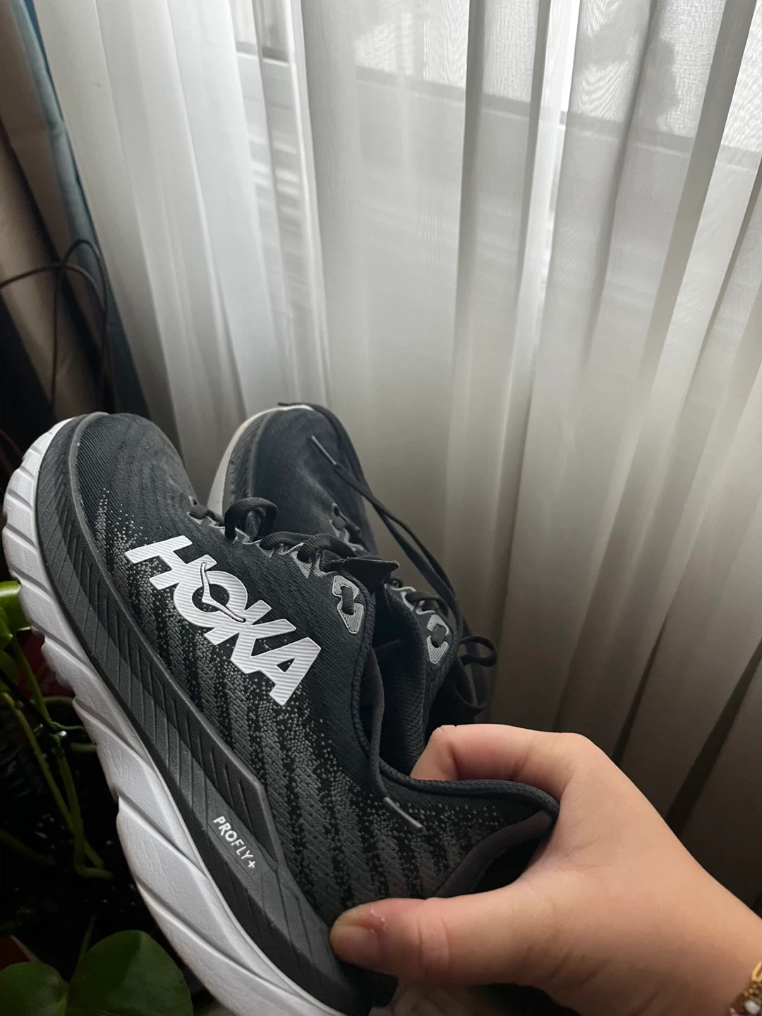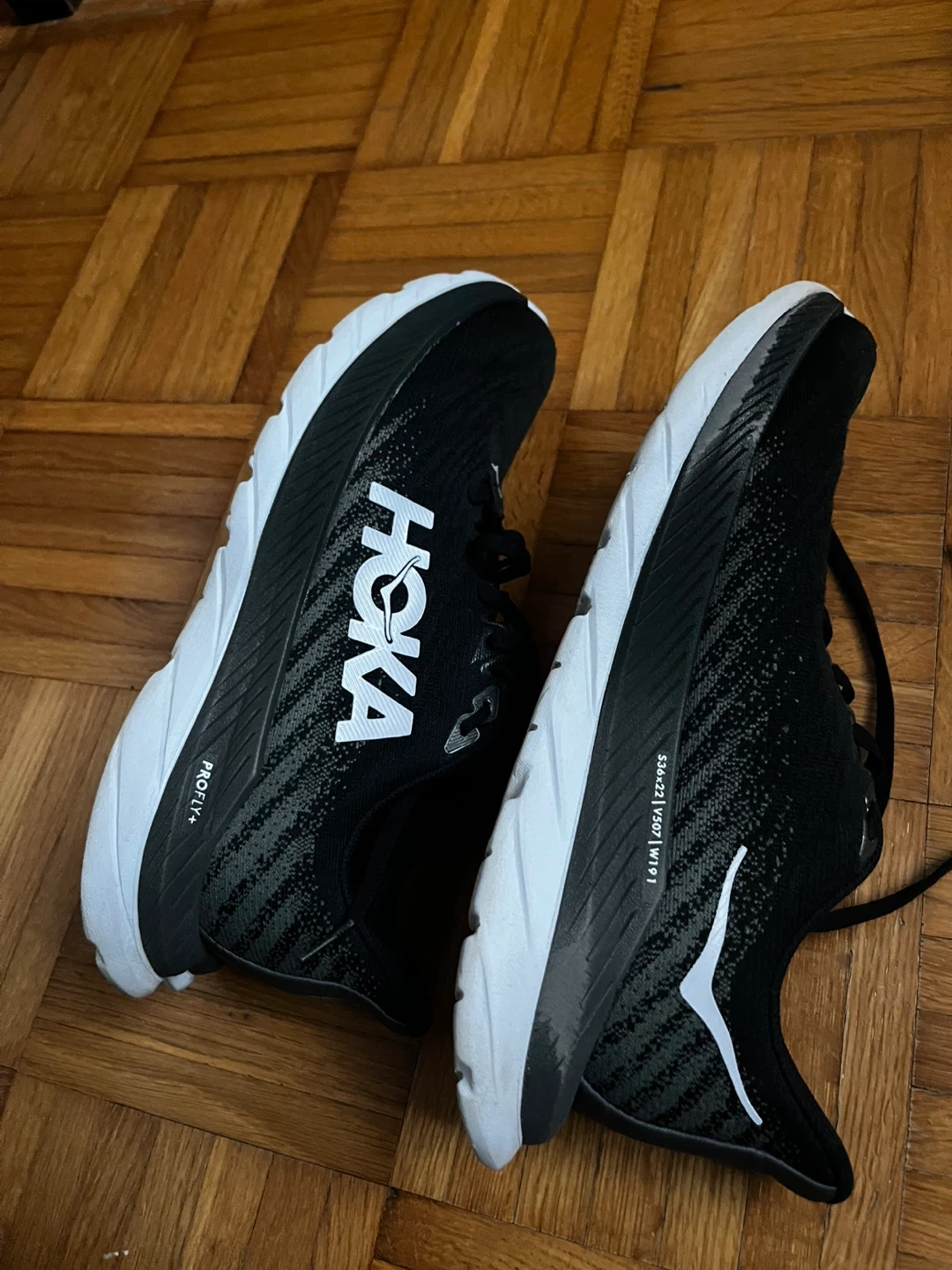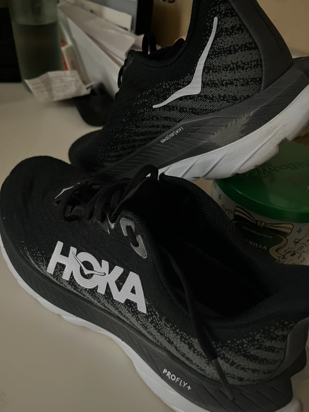 Hoka Clifton 9 running shoes in black and white. These shoes feature a knit upper and PROFLY+ midsole. They're great for road running. They are still in good condition maybe a few scuffs but almost new like