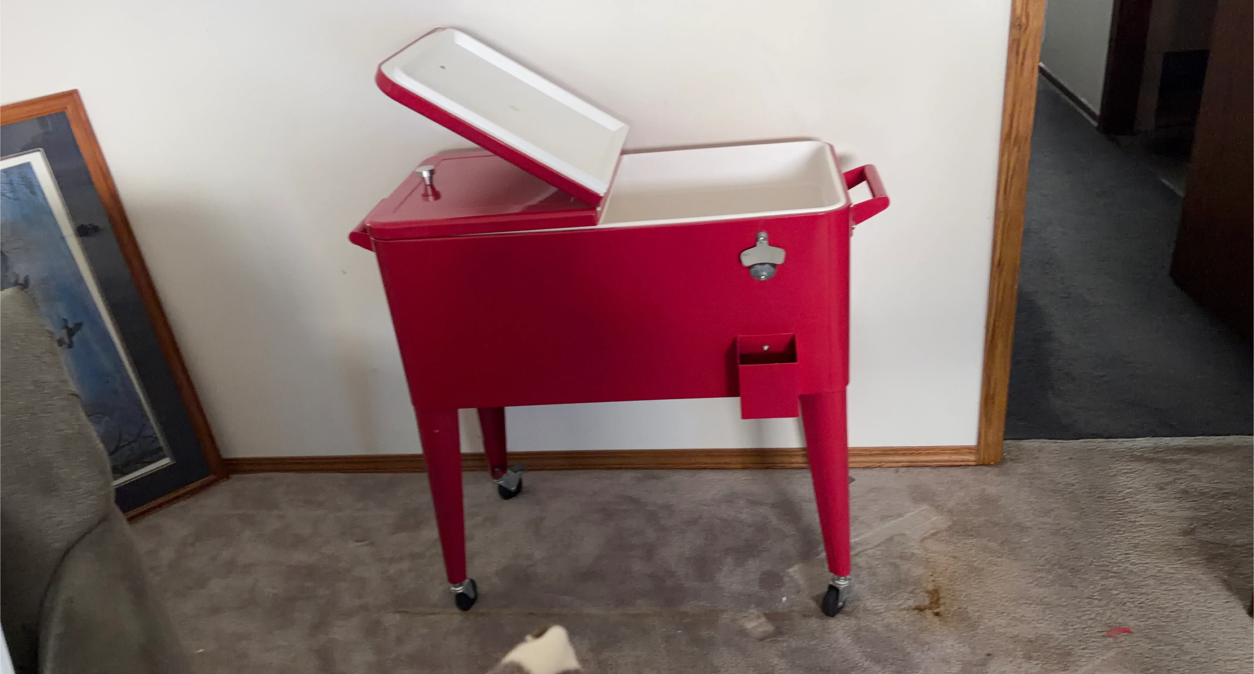 This red rolling cooler cart is perfect for backyard BBQs and parties. It's got a built-in bottle opener and a removable lid. The caster wheels make it easy to move around. It's great for keeping drinks chilled on hot summer days!