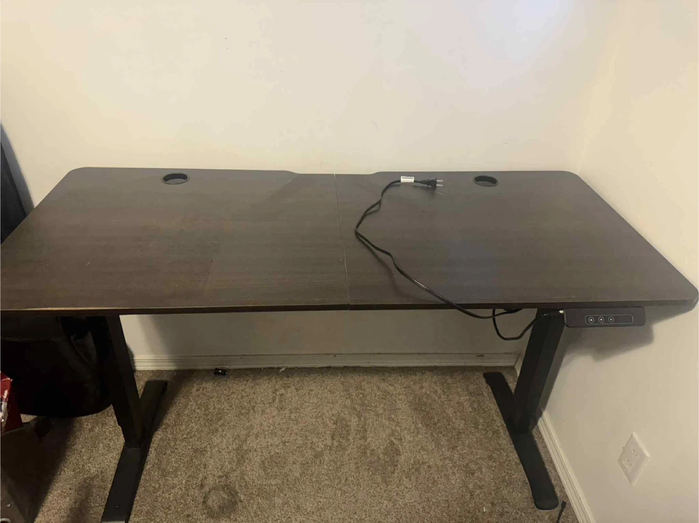 This electric standing desk features a dark wood finish. It's adjustable in height for comfortable sitting or standing. Has cable management holes on the desktop. 43''24"
