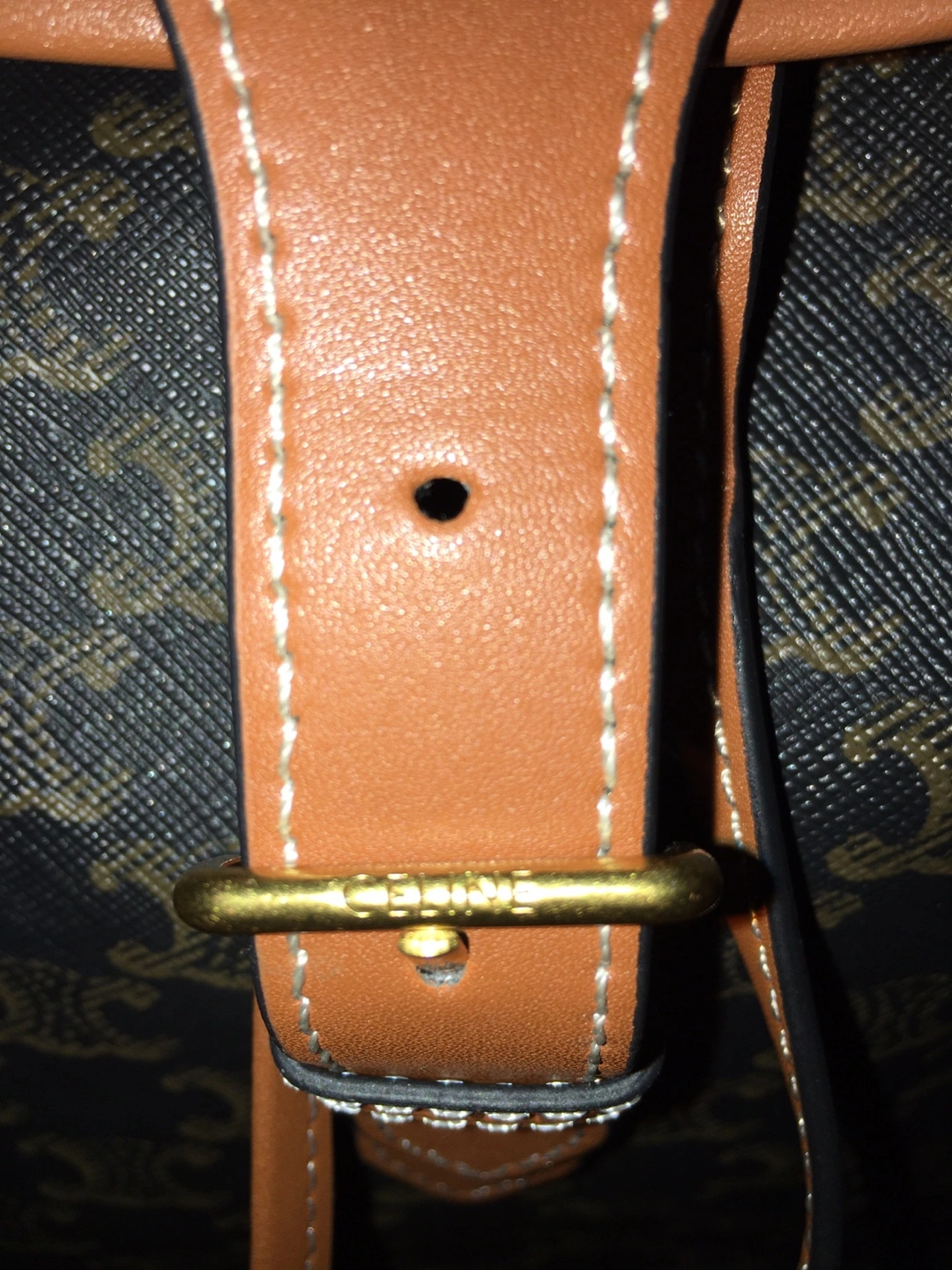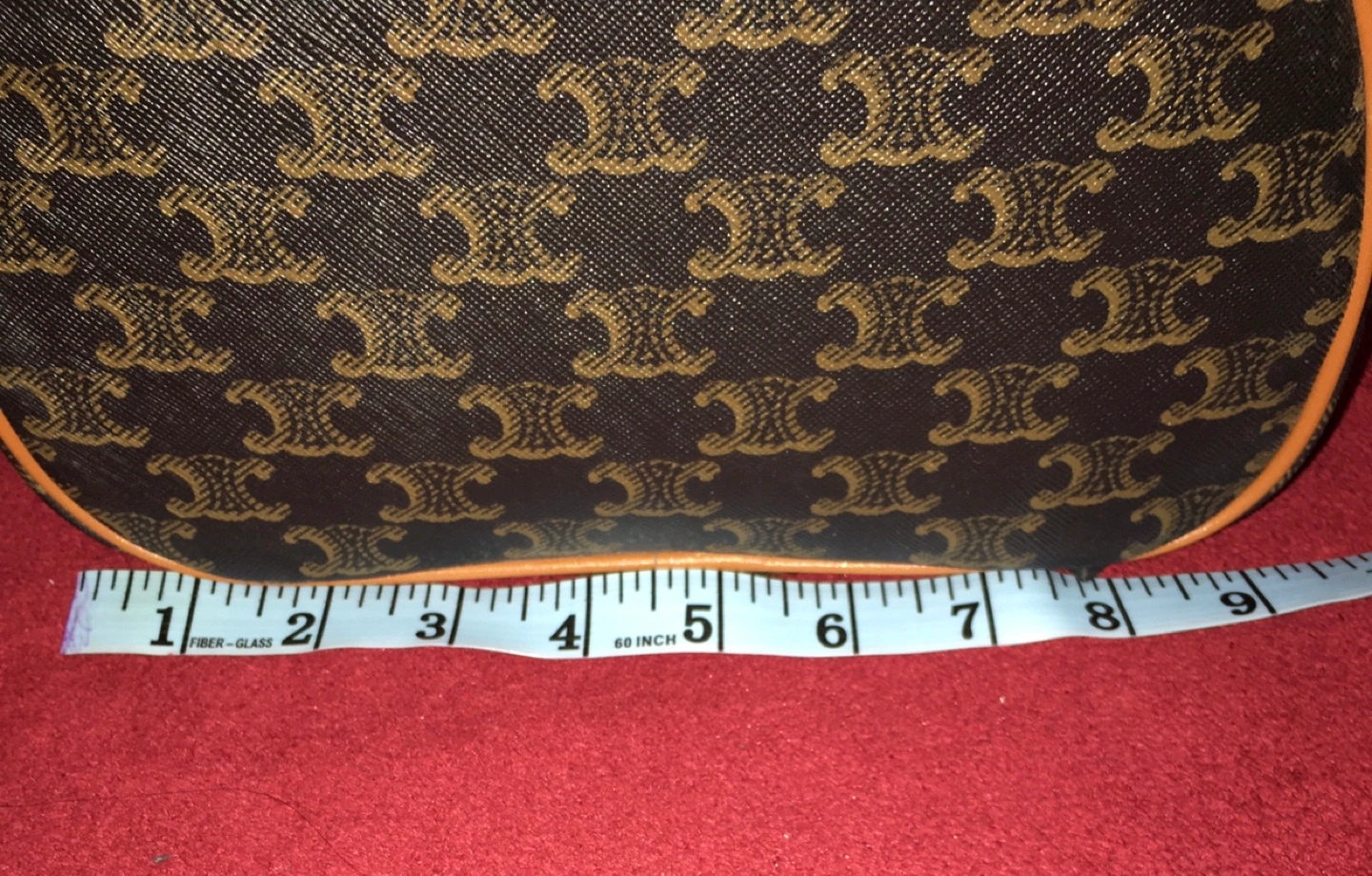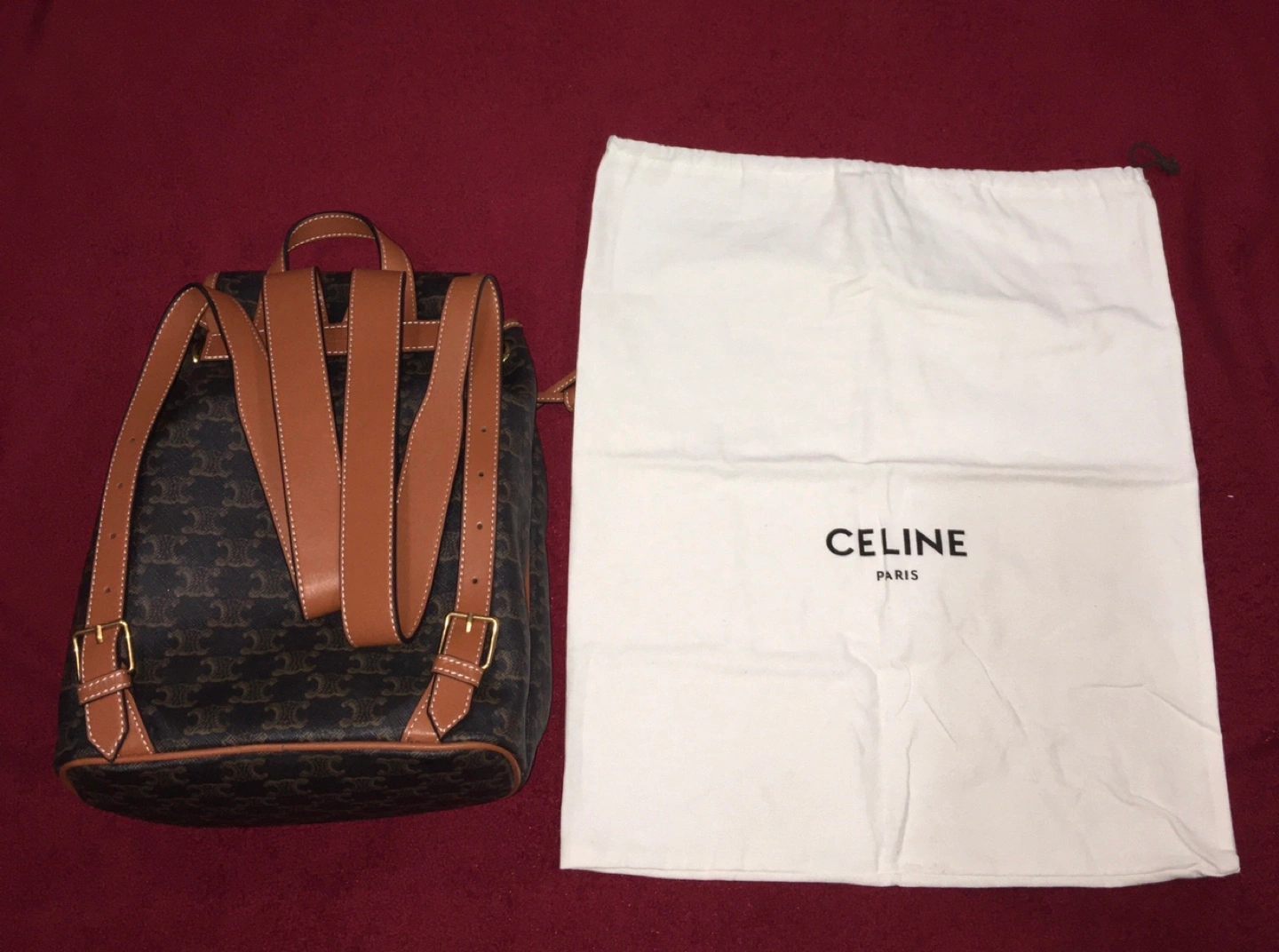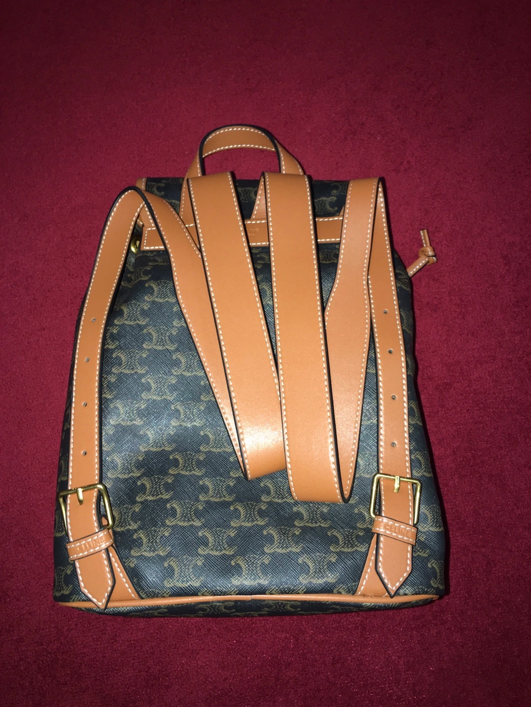 This Celine backpack features the classic Triomphe canvas pattern with tan leather trim. It has adjustable shoulder straps and a drawstring closure with a buckle flap. The dimensions are approximately 11 inches high by 9 inches wide.